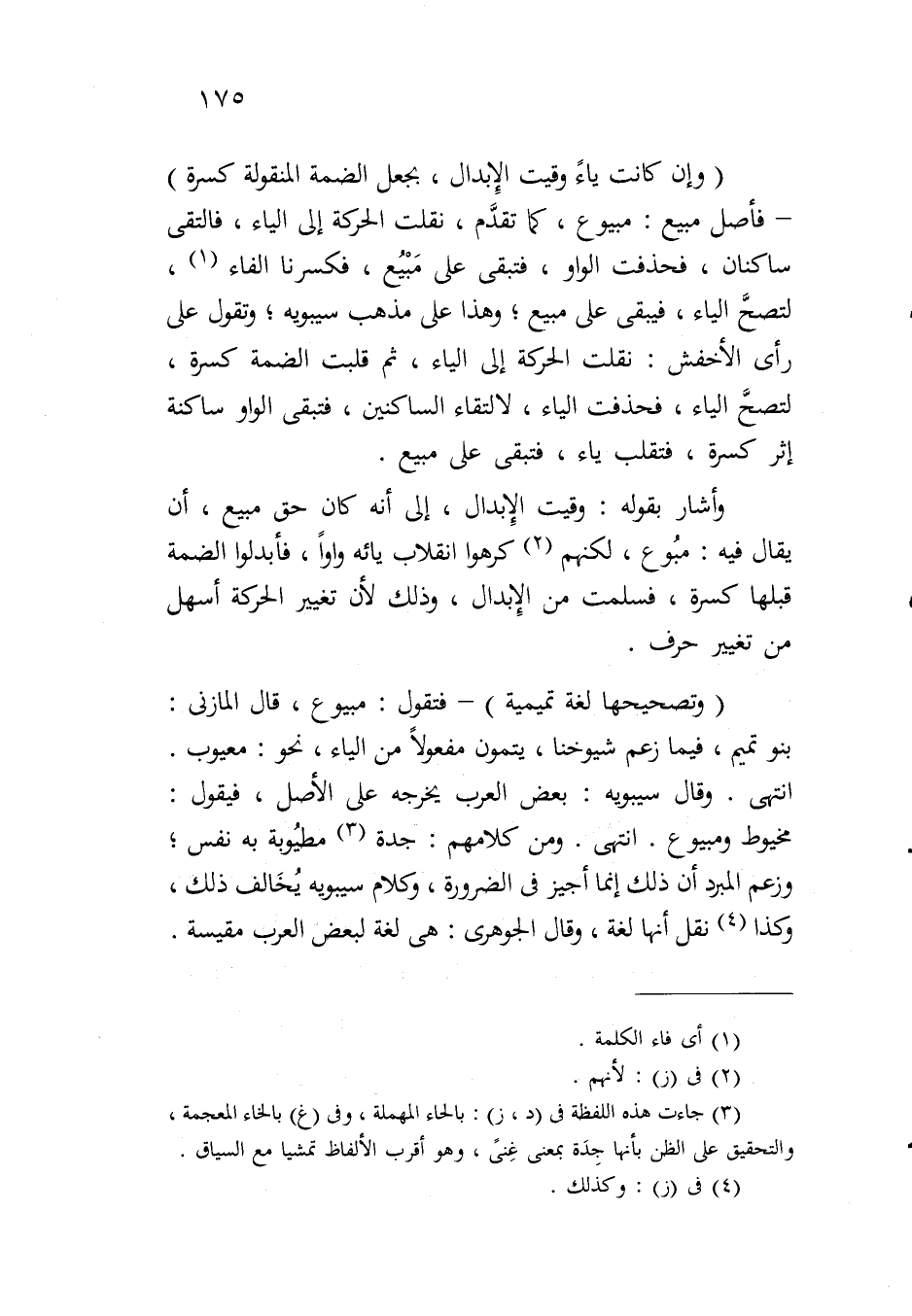 وأشار بقوله: وقيت الإبدال، إلى أنه كان حق مبيع، أن يقال فيه: مبوع، لكنهم كرهوا انقلاب يائه واواً، فأبدلوا الضمة قبلها كسرة، فسلمت من الإبدال، وذلك لأن تغيير الحركة أسهل من تغيير حرف.