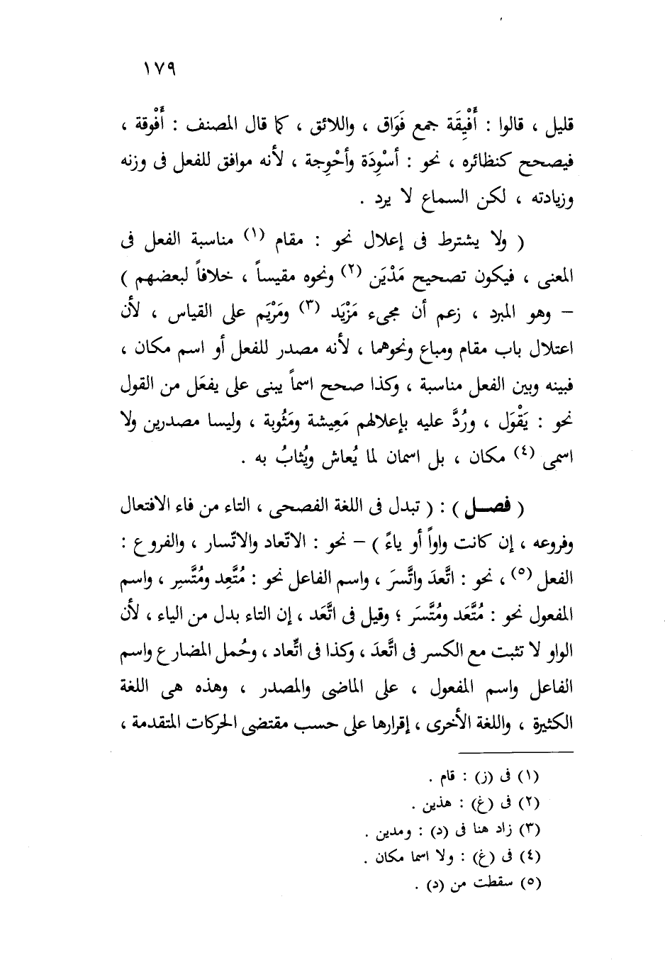 (فصل): (تبدل في اللغة الفصحى، التاء من فاء الافتعال وفروعه، إن كانت واواً أو ياء) - نحو: الاتعاد والاتسار، والفروع: الفعل، نحو: اتعد واتسر، واسم الفاعل نحو: متعد ومتسر، واسم المفعول نحو: متعد ومتسر؛ وقيل في اتعد، إن التاء بدل من الياء، لأن الواو لا تثبت مع الكسر في اتعد، وكذا في اتعاد، وحمل المضارع واسم الفاعل واسم المفعول، على الماضي والمصدر، وهذه هي اللغة الكثيرة، واللغة الأخرى، إقرارها على حسب مقتضى الحركات المتقدمة،