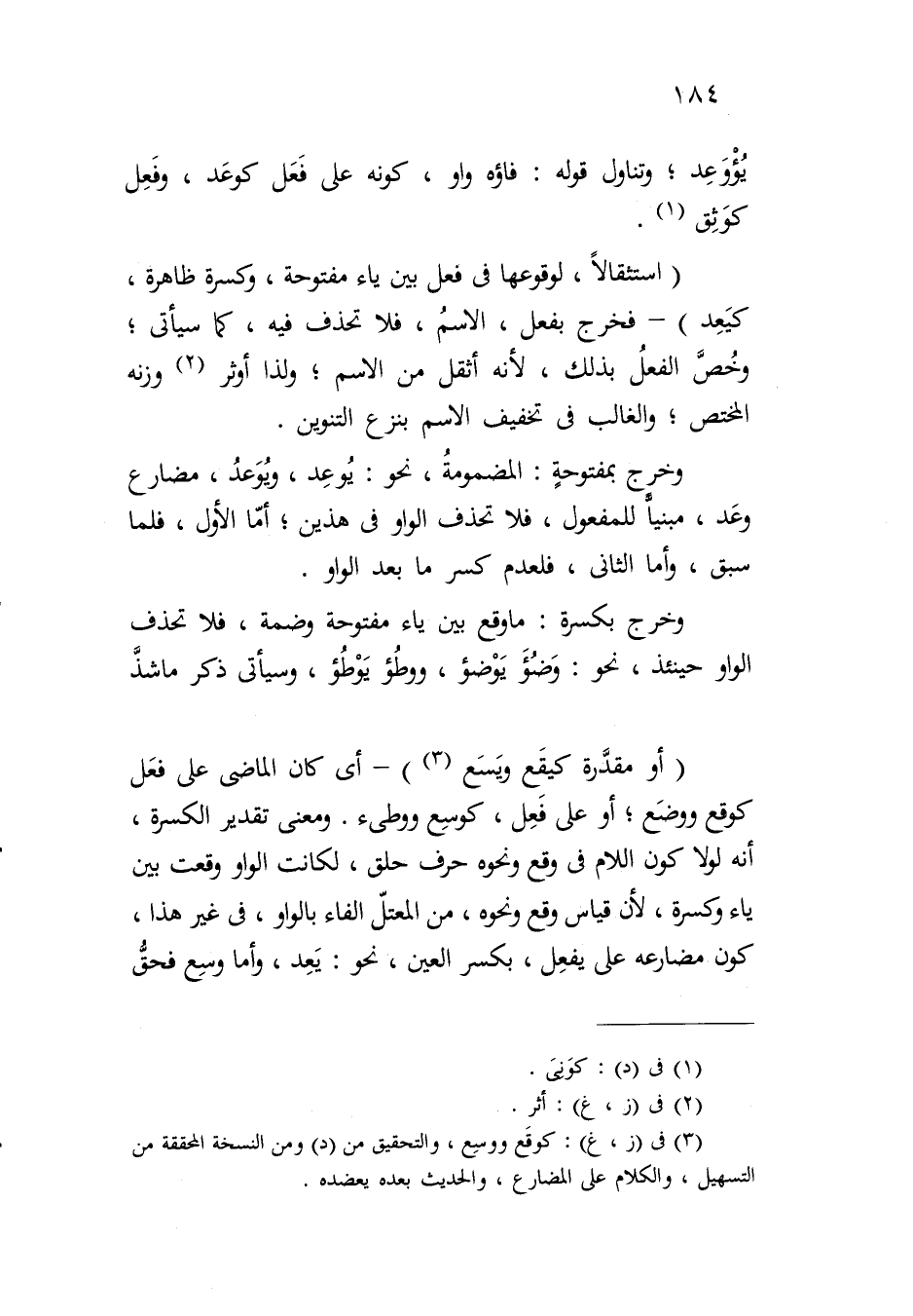(استثقالاً، لوقوعها في فعل بين ياء مفتوحة، وكسرة ظاهرة، كيعد) - فخرج بفعل، الاسم، فلا تحذف فيه، كما سيأتي؛ وخص الفعل بذلك، لأنه أثقل من الاسم؛ ولذلك أوثر وزنه المختص؛ والغالب في تخفيف الاسم بنزع التنوين.