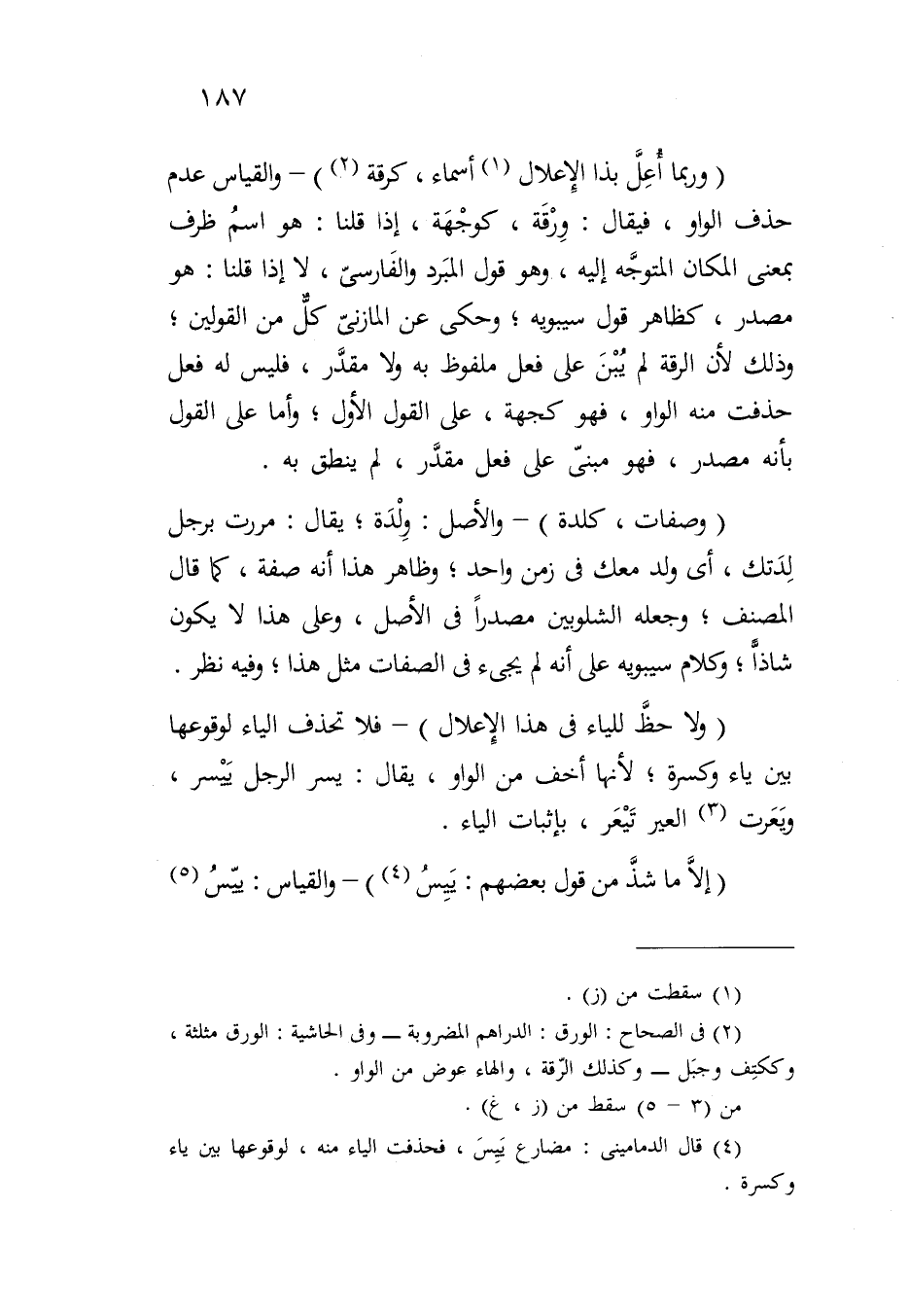 (وربما أعل بذا الإعلال أسماء، كرقة) - والقياس عدم حذف الواو، فيقال: ورقة، كوجهة، إذا قلنا: هو اسم ظرف بمعنى المكان المتوجه إليه، وهو قول المبرد والفارسي، لا إذا قلنا: هو مصدر، كظاهر قول سيبويه؛ وحكى عن المازني كل من القولين؛ وذلك لأن الرقة لم يبن على فعل ملفوظ به ولا مقدر، فليس له فعل حذفت منه الواو، فهو كجهة، على القول الأول؛ وأما على القول بأنه مصدر، فهو مبني على فعل مقدر، لم ينطق به.