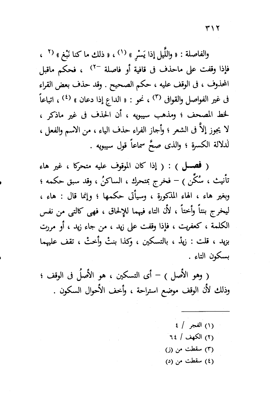 والفاصلة: "والليل إذا يسر"، "ذلك ما كنا نبغ"، فإذا وقفت على ما حذف في قافية أو فاصلة، فحكم ما قبل المحذوف، في الوقف عليه، حكم الصحيح. وقد حذف بعض القراء في غير الفواصل والقوافي، نحو: "الداع إذا دعان"، اتباعاً لخط المصحف؛ ومذهب سيبويه، أن الحذف في غير ما ذكر، لا يجوز إلا في الشعر؛ وأجاز الفراء حذف الياء، من الاسم والفعل، لدلالة الكسرة؛ والذي صح سماعاً قول سيبويه.
