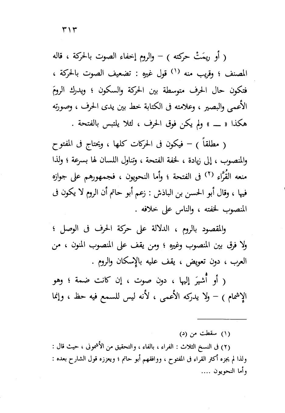 (مطلقاً) - فيكون في الحركات كلها، ويحتاج في المفتوح والمنصوب، إلى زيادة، لخفة الفتحة، وتناول اللسان لها بسرعة؛ ولذا منعه القراء في الفتحة؛ وأما النحويون، فجمهورهم على جوازه فيها، وقال أبو الحسن بن الباذش: زعم أبو حاتم أن الروم لا يكون في المنصوب لخفته، والناس على خلافه.