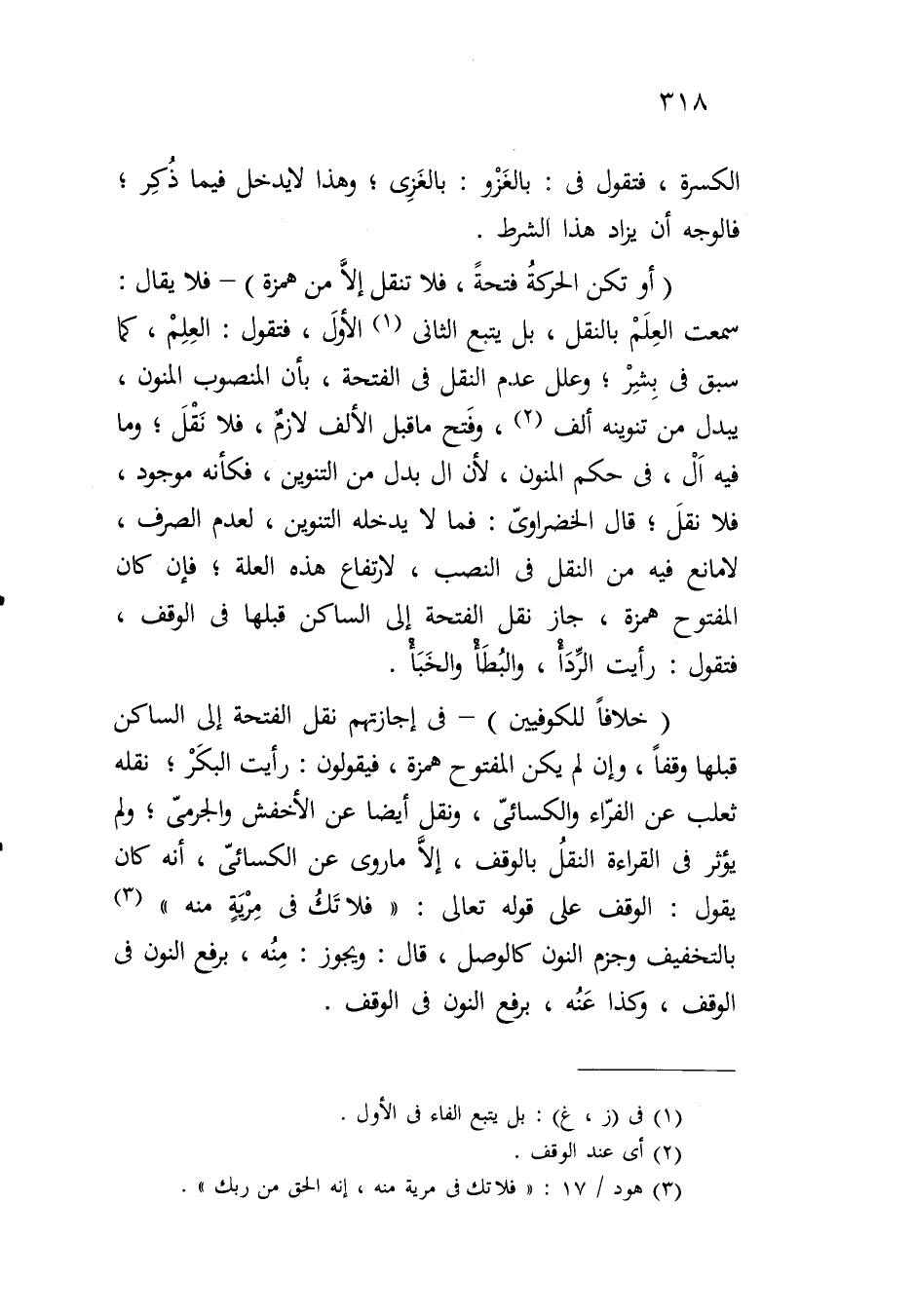 (خلافاً للكوفيين) - في إجازتهم نقل الفتحة إلى الساكن قبلها وقفاً، وإن لم يكن المفتوح همزة، فيقولون: رأيت البكر؛ نقله ثعلب عن الفراء والكسائي، ونقل أيضاً عن الأخفش والجرمي؛ ولم يؤثر في القراءة النقل بالوقف، إلا ما روي عن الكسائي، أنه كان يقول: الوقف على قوله تعالى: "فلا تك في مرية منه" بالتخفيف وجزم النون كالوصل، قال: ويجوز: منه، برفع النون في الوقف، وكذا عنه، برفع النون في الوقف.