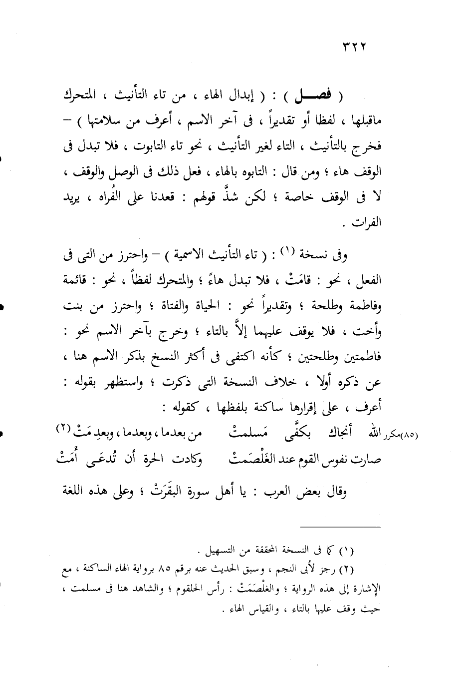 (فصل): (إبدال الهاء، من تاء التأنيث، المتحرك ما قبلها، لفظاً أو تقديراً، في آخر الاسم، أعرف من سلامتها) - فخرج بالتأنيث، التاء لغير التأنيث، نحو تاء التابوت، فلا تبدل في الوقف هاء؛ ومن قال: التابوه بالهاء، فعل ذلك في الوصل والوقف، لا في الوقف خاصة؛ لكن شذ قولهم: قعدنا على الفراه، يريد الفرات.