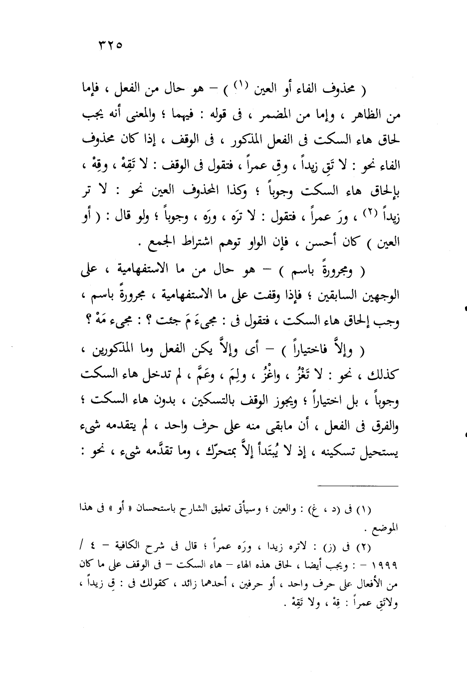 (محذوف الفاء أو العين) - هو حال من الفعل، فإما من الظاهر، وإما من المضمر، في قوله: فيهما؛ والمعنى أنه يجب لحاق هاء السكت في الفعل المذكور، في الوقف، إذا كان محذوف الفاء نحو: لا تق زيداً، وق عمراً، فتقول في الوقف: لا تقه، وقه، بإلحاق هاء السكت وجوباً؛ وكذا المحذوف العين نحو: لا تر زيداً، ور عمراً، فتقول: لا تره، وره، وجوباً؛ ولو قال: (أو العين) كان أحسن، فإن الواو توهم اشتراط الجمع.