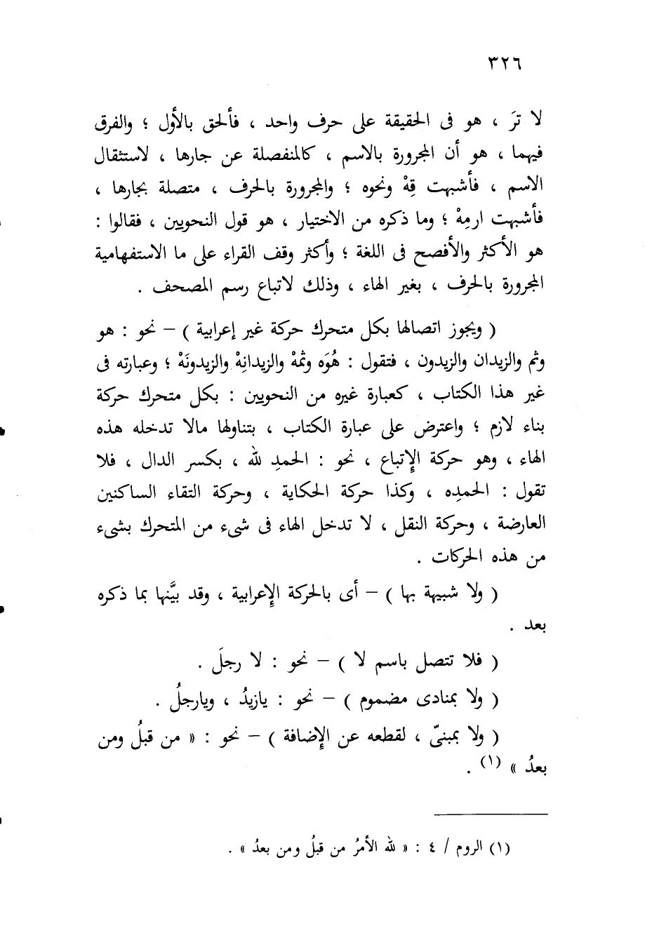 (ويجوز اتصالها بكل متحرك حركة غير إعرابية) - نحو: هو وثم والزيدان والزيدون، فتقول: هوه وثمه والزيدانه والزيدونه؛ وعبارته في غير هذا الكتاب، كعبارة غيره من النحويين: بكل متحرك حركة بناء لازم؛ واعترض على عبارة الكتاب، بتناولها ما لا تدخله هذه الهاء، وهو حركة الإتباع، نحو: الحمد لله، بكسر الدال، فلا تقول: الحمده، وكذا حركة الحكاية، وحركة التقاء الساكنين العارضة، وحركة النقل، لا تدخل الهاء في شيء من المتحرك بشيء من هذه الحركات.