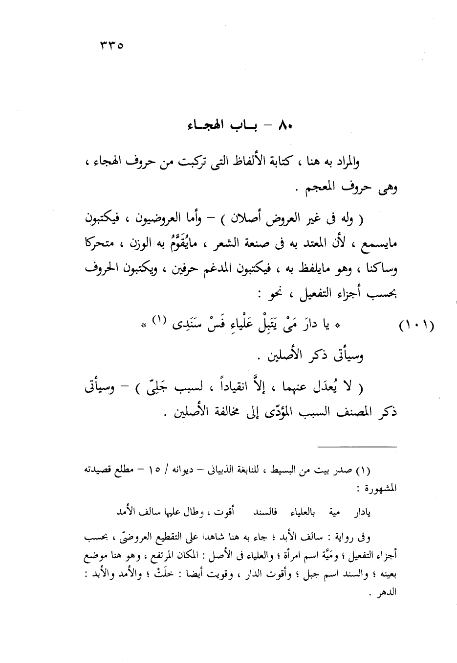 (وله في غير العروض أصلان) - وأما العروضيون، فيكتبون ما يسمع، لأن المعتد به في صنعة الشعر، ما يقوم به الوزن، متحركاً وساكناً، وهو ما يلفظ به، فيكتبون المدغم حرفين، ويكتبون الحروف بحسب أجزاء التفعيل، نحو:
