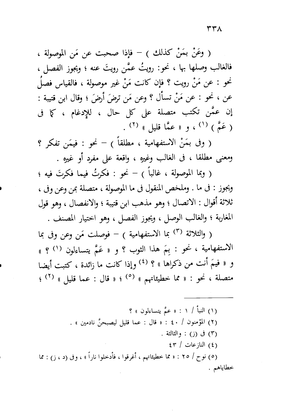 (وعن بمن كذلك) - فإذا صحبت عن من الموصولة، فالغالب وصلها بها، نحو: رويت عمن رويت عنه؛ ويجوز الفصل، نحو: عن من رويت؟ فإن كانت من غير موصولة، فالقياس فصل عن، نحو: عن من تسأل؟ وعن من ترض أرض؛ وقال ابن قتيبة: إن عمن تكتب متصلة على كل حال، للإدغام، كما في (عم)، و"عما قليل".