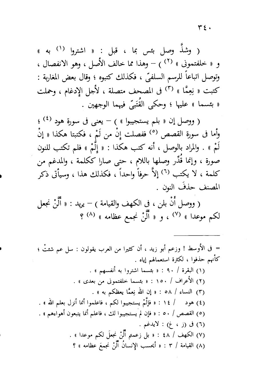 (ووصل إن "بلم يستجيبوا") - يعني في سورة هود؛ وأما في سورة القصص ففصلت إن من لم، فكتبتا هكذا "إن لم". والمراد بالوصل، أنه كتب هكذا: "إلم" فلم تكتب للنون صورة، وإنما قدِّر وصلها باللام، حتى صارا ككلمة، والمدغم من كلمة، لا يكتب إلا حرفاً واحداً، فكذلك هذا، وسيأتي ذكر المصنف حذف النون.