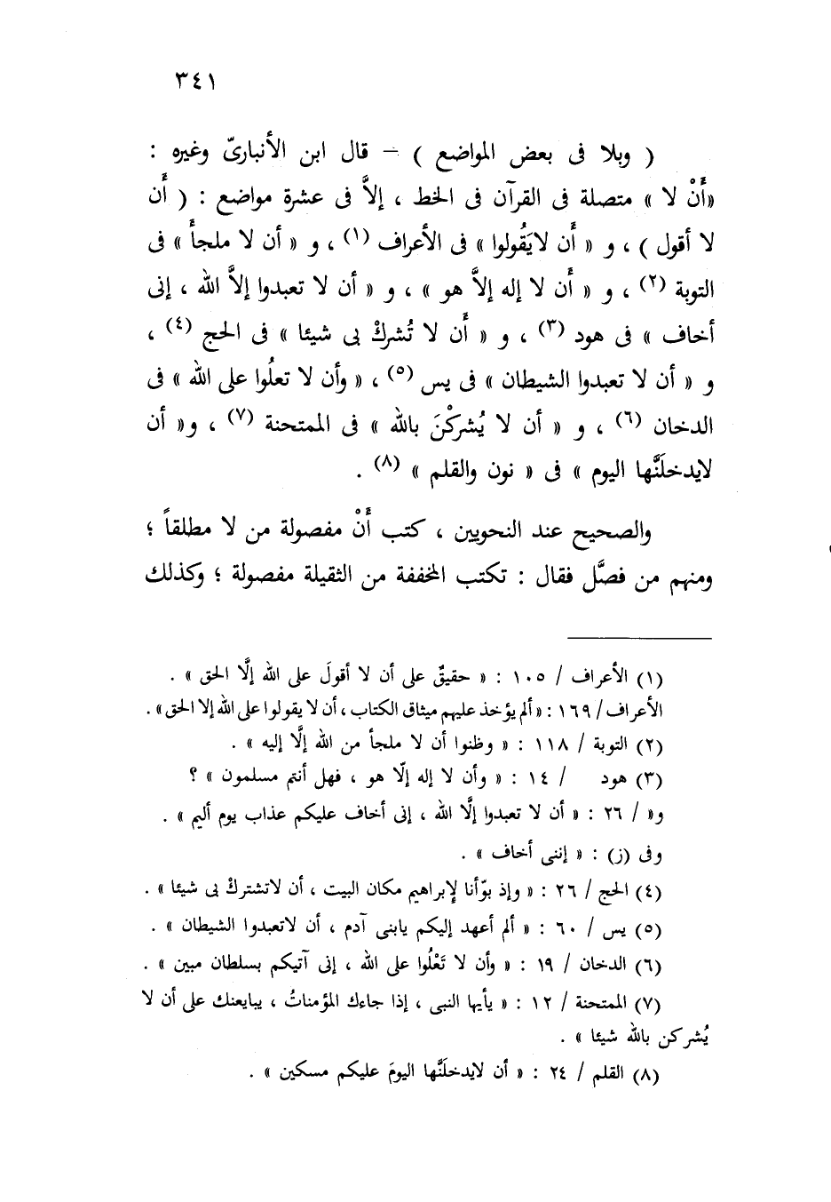 (وبلا في بعض المواضع) - قال ابن الأنباري وغيره: "أن لا" متصلة في القرآن في الخط، إلا في عشرة مواضع: (أن لا أقول)، و"أن لا يقولوا" في الأعراب، و"أن لا ملجأ" في التوبة، و"أن لا إله إلا هو"، و"أن لا تعبدوا إلا الله، إني أخاف" في هود، و"أن لا تشرك بي شيئاً" في الحج، و"أن لا تعبدوا الشيطان" في يس، "وأن لا تعلوا على الله" في الدخان، و"أن لا يشركن بالله" في الممتحنة، و"أن لا يدخلنها اليوم" في "نون والقلم".