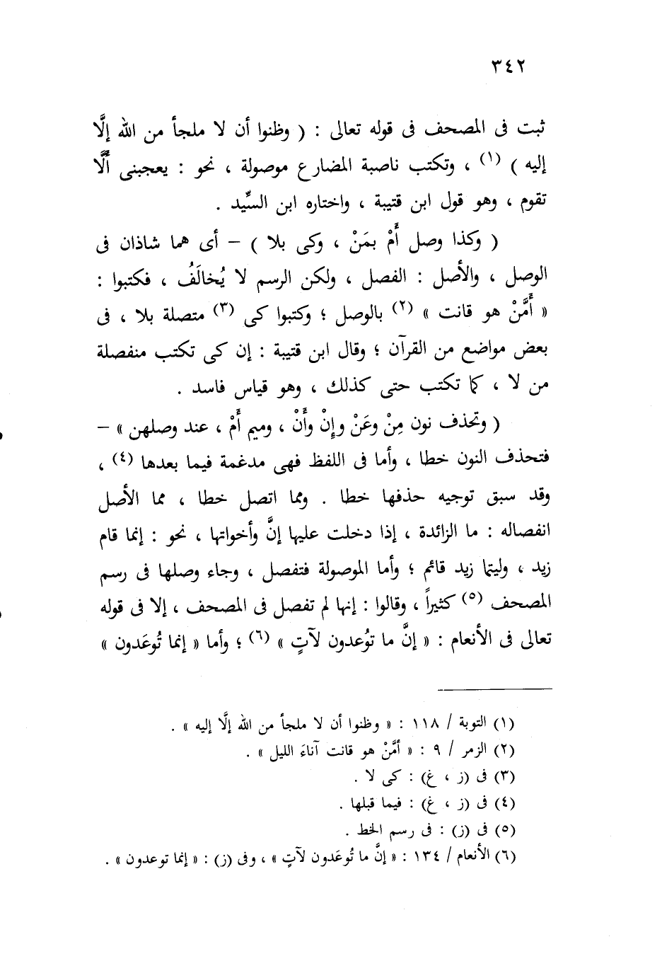 (وتحذف نون من وعن وإِنْ وأَنْ، وميم أم، عند وصلهن"- فتحذف النون خطا، وأما في اللفظ فهي مدغمة فيما بعدها، وقد سبق توجيه حذفها خطا. ومما اتصل خطا، مما الأصل انفصاله: ما الزائدة، إذا دخلت عليها إن وأخواتها، نحو: إنما قام زيد، وليتما زيد قائم؛ وأما الموصولة فتفصل، وجاء وصلها في رسم المصحف كثيراً، وقالوا: إنها لم تفصل في المصحف، إلا في قوله تعالى في الأنعام: "إن ما توعدون لآت"؛ وأما "إنما توعدون"