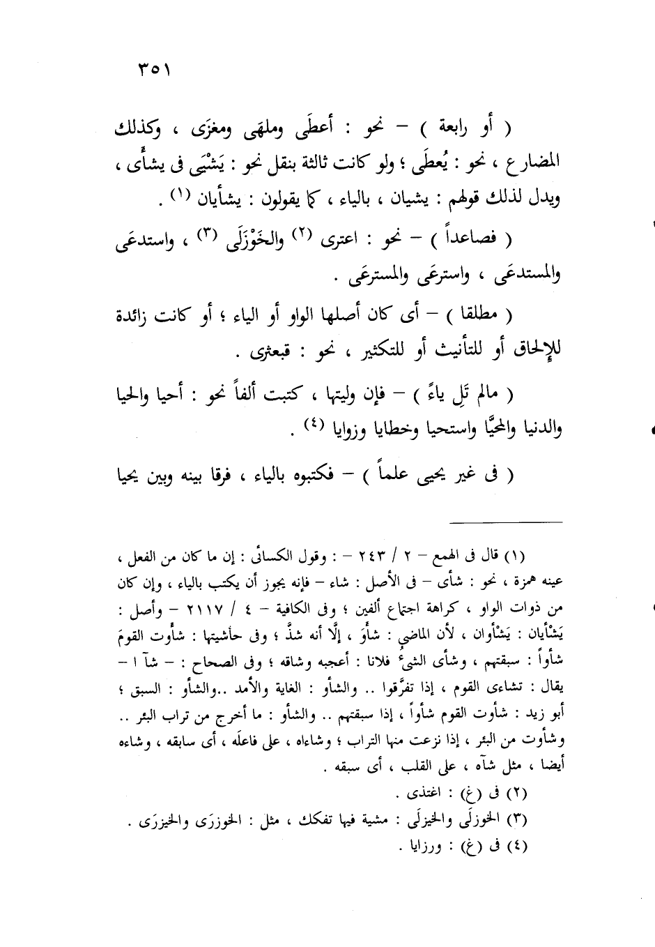 (أو رابعة) - نحو: أعطى وملهى ومغزى، وكذلك المضارع، نحو: يعطى؛ ولو كانت ثالثة بنقل نحو: يشيى في يشأى، ويدل لذلك قولهم: يشيان، بالياء، كما يقولون: يشأيان.