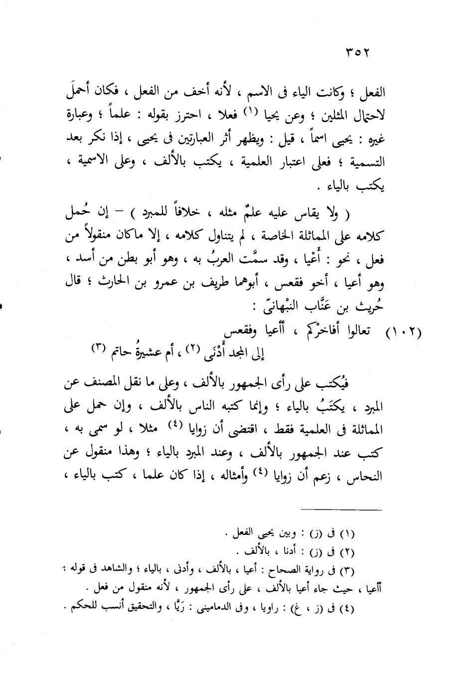 فيكتب على رأي الجمهور بالألف، وعلى ما نقل المصنف عن المبرد، يكتب بالياء؛ وإنما كتبه الناس بالألف، وإن حمل على المماثلة في العلمية فقط، اقتضى أن زوايا مثلاً، لو سمي به، كتب عند الجمهور بالألف، وعند المبرد بالياء؛ وهذا منقول عن النحاس، زعم أن زوايا وأمثاله، إذا كان علماً، كتب بالياء،