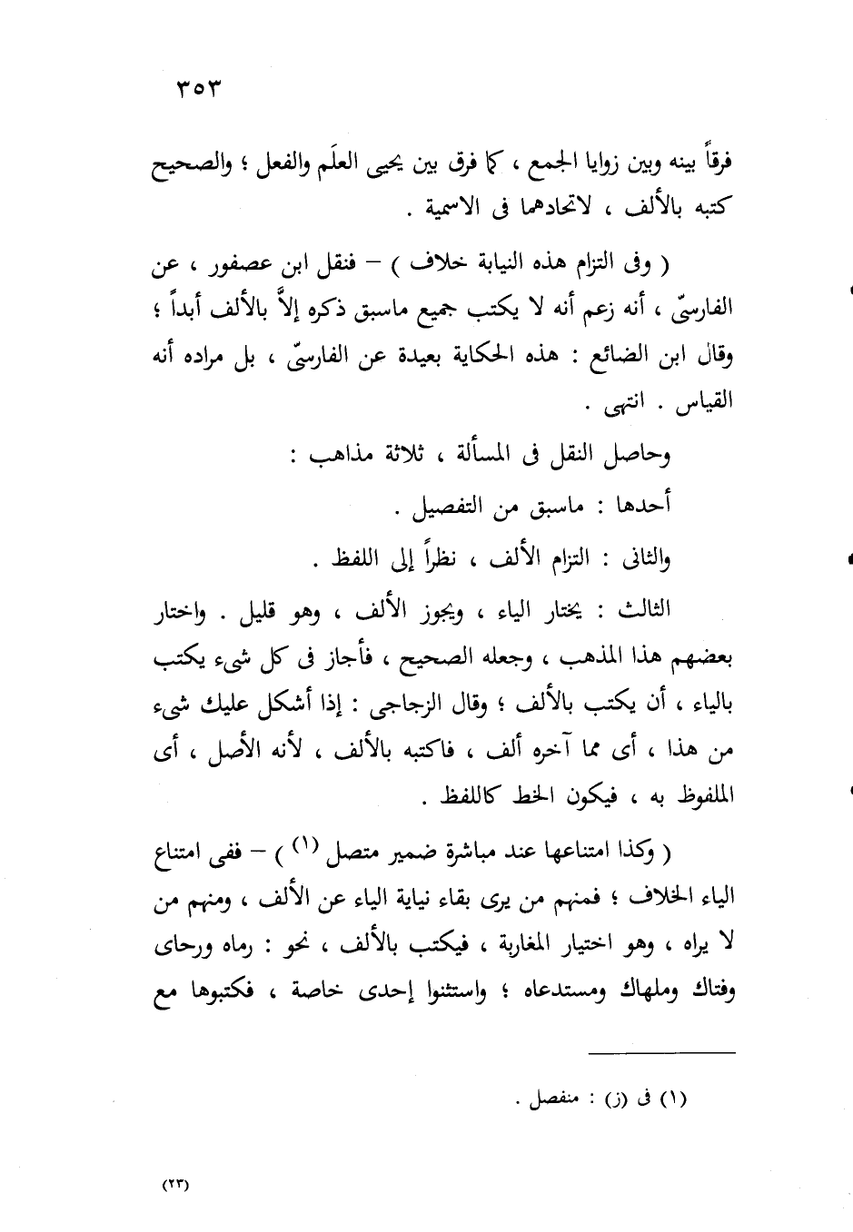 الثالث: يختار الياء، ويجوز الألف، وهو قليل. واختار بعضهم هذا المذهب، وجعله الصحيح، فأجاز في كل شيء يكتب بالياء، أن يكتب بالألف؛ وقال الزجاجي: إذا أشكل عليك شيء من هذا، أي مما آخره ألف، فاكتبه بالألف، لأنه الأصل، أي الملفوظ به، فيكون الخط كاللفظ.