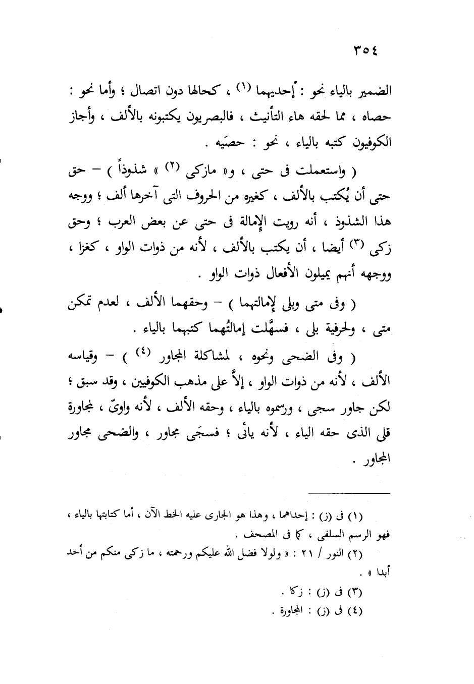(واستعملت في حتى، و"ما زكى" شذوذاً) - حق حتى أن يكتب بالألف، كغيره من الحروف التي آخرها ألف؛ ووجه هذا الشذوذ، أنه رويت الإمالة في حتى عن بعض العرب؛ وحق زكي أيضاً، أن يكتب بالألف، لأنه من ذوات الواو، كغزا، ووجهه أنهم يميلون الأفعال ذوات الواو.
