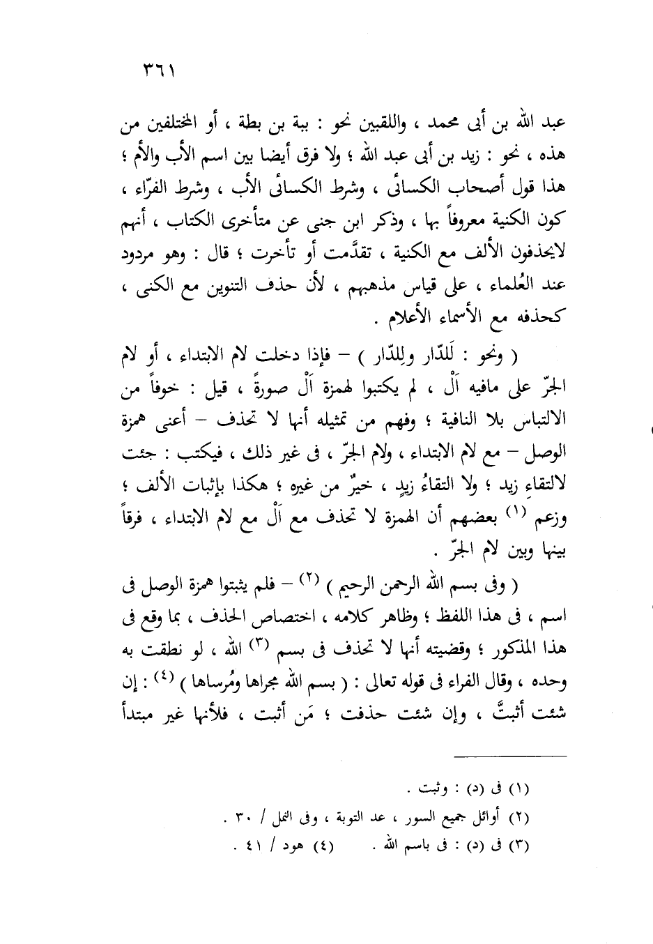 عبد الله بن أبي محمد، واللقبين نحو: ببة بن بطة، أو المختلفين من هذه، نحو: زيد بن أبي عبد الله؛ ولا فرق أيضاً بين اسم الأب والأم؛ هذا قول أصحاب الكسائي، وشرط الكسائي الأب، وشرط الفراء، كون الكنية معروفاً بها، وذكر ابن جني عن متأخري الكتاب، أنهم لا يحذفون الألف مع الكنية، تقدمت أو تأخرت؛ قال: وهو مردود عند العلماء، على قياس مذهبهم، لأن حذف التنوين مع الكني، كحذفه مع الأسماء الأعلام.