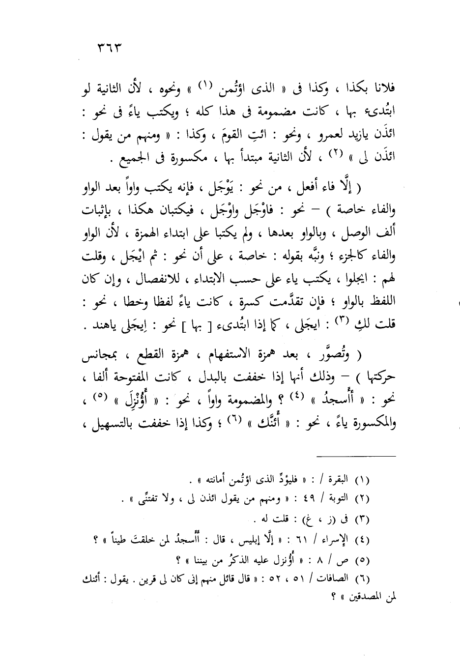 فلاناً بكذا، وكذا في "الذي اؤتمن" ونحوه، لأن الثانية لو ابتدئ بها، كانت مضمومة في هذا كله؛ ويكتب ياء في نحو: ائذن يا زيد لعمرو، ونحو: ائت القوم، وكذا: "ومنهم من يقول: ائذن لي"، لأن الثانية مبتدأ بها، مكسورة في الجميع.