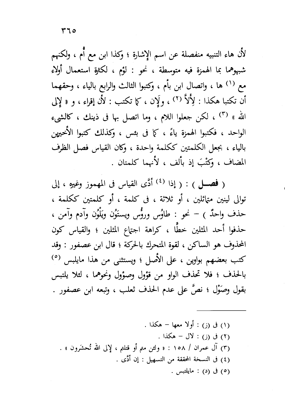 لأن هاء التنبيه منفصلة عن اسم الإشارة؛ وكذا ابن مع أم، ولكنهم شبهوهما بما الهمزة فيه متوسطة، نحو: لؤم، لكثرة استعمال أولاء مع ها، واتصال ابن بأم، وكتبوا الثالث والرابع بالياء، وحقهما أن تكتبا هكذا: لِأَلَّا، ولإن، كما تكتب: لأن إقراء، و"لإلى الله"، لكن جعلوا اللام، وما اتصل بها في ذينك، كالشيء الواحد، فكتبوا الهمزة ياء، كما في بئس، وكذلك كتبوا الأخيرين بالياء، بجعل الكلمتين ككلمة واحدة، وكان القياس فصل الظرف المضاف، وكتب إذ بألف، لأنهما كلمتان.