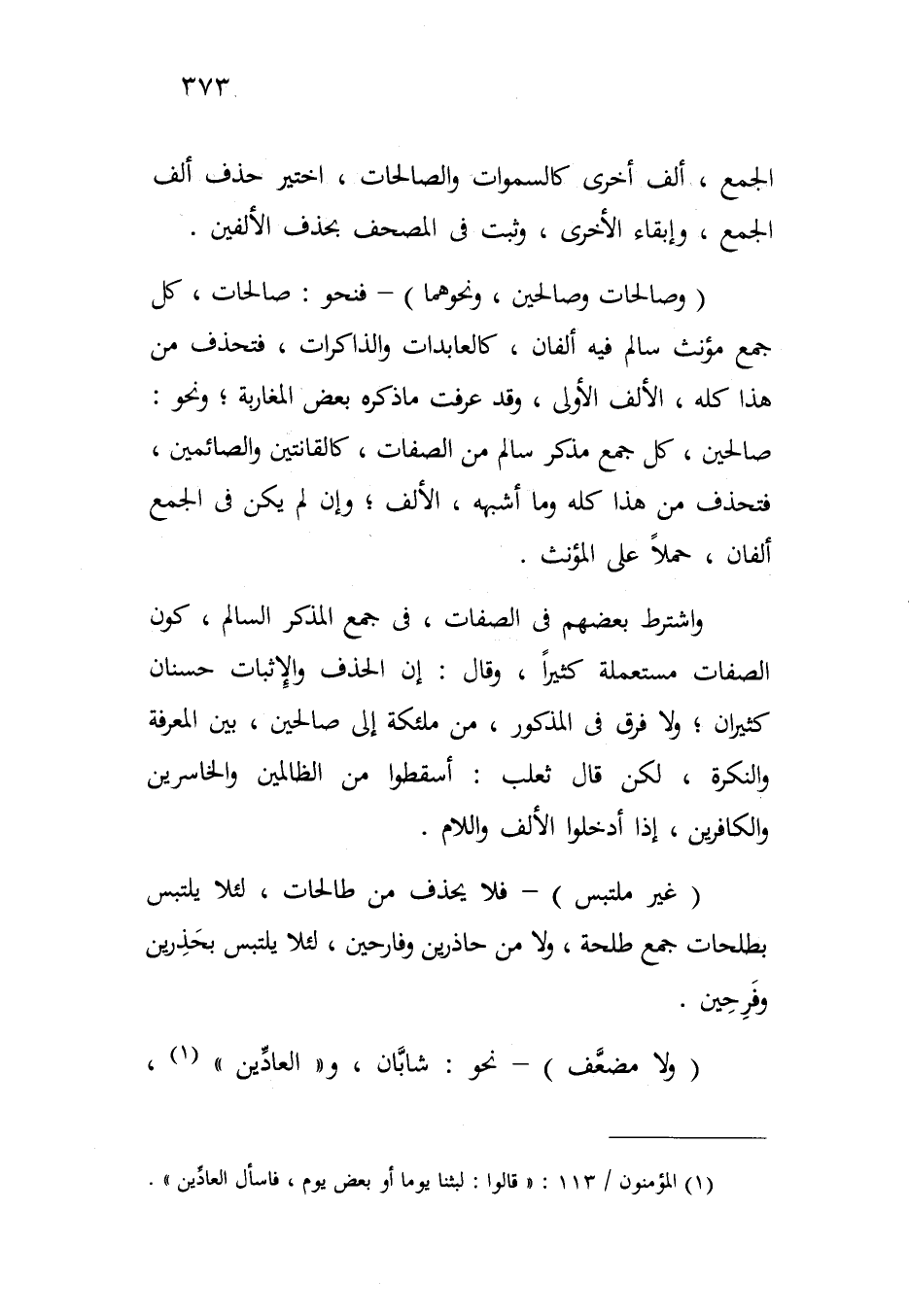 واشترط بعضهم في الصفات، في جمع المذكر السالم، كون الصفات مستعملة كثيراً، وقال: إن الحذف والإثبات حسنان كثيران؛ ولا فرق في المذكور، من ملئكة إلى صالحين، بين المعرفة والنكرة، لكن قال ثعلب: أسقطوا من الظالمين والخاسرين والكافرين، إذا أدخلوا الألف واللام.