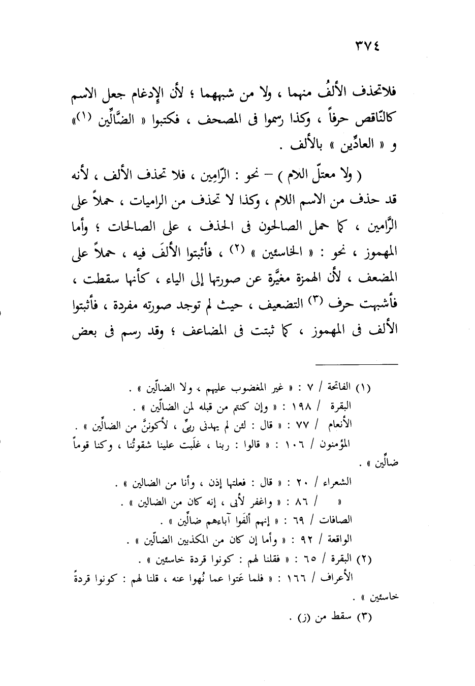 فلا تحذف الألف منهما، ولا من شبههما؛ لأن الإدغام جعل الاسم كالناقص حرفاً، وكذا رسموا في المصحف، فكتبوا "الضالين" و"العادين" بالألف.