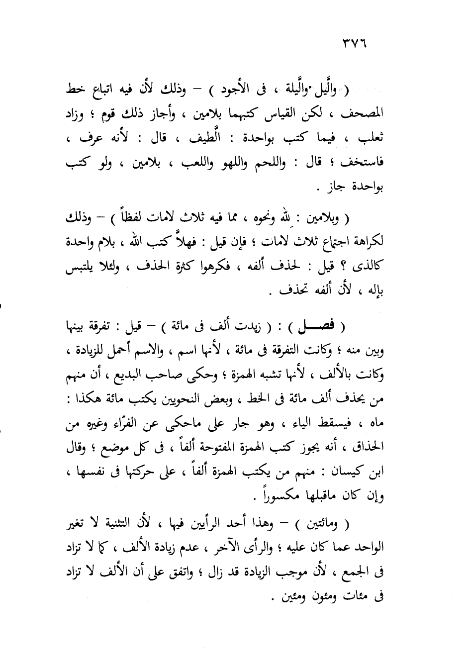 (فصل): (زيدت ألف في مائة) - قيل: تفرقة بينها وبين منه؛ وكانت التفرقة في مائة، لأنها اسم، والاسم أحمل للزيادة، وكانت بالألف، لأنها تشبه الهمزة؛ وحكى صاحب البديع، أن منهم من يحذف ألف مائة في الخط، وبعض النحويين يكتب مائة هكذا: ماه، فيسقط الياء، وهو جار على ما حكى عن الفراء وغيره من الحذاق، أنه يجوز كتب الهمزة المفتوحة ألفاً، في كل موضع؛ وقال ابن كيسان: منهم من يكتب الهمزة ألفاً، على حركتها في نفسها، وإن كان ما قبلها مكسوراً.