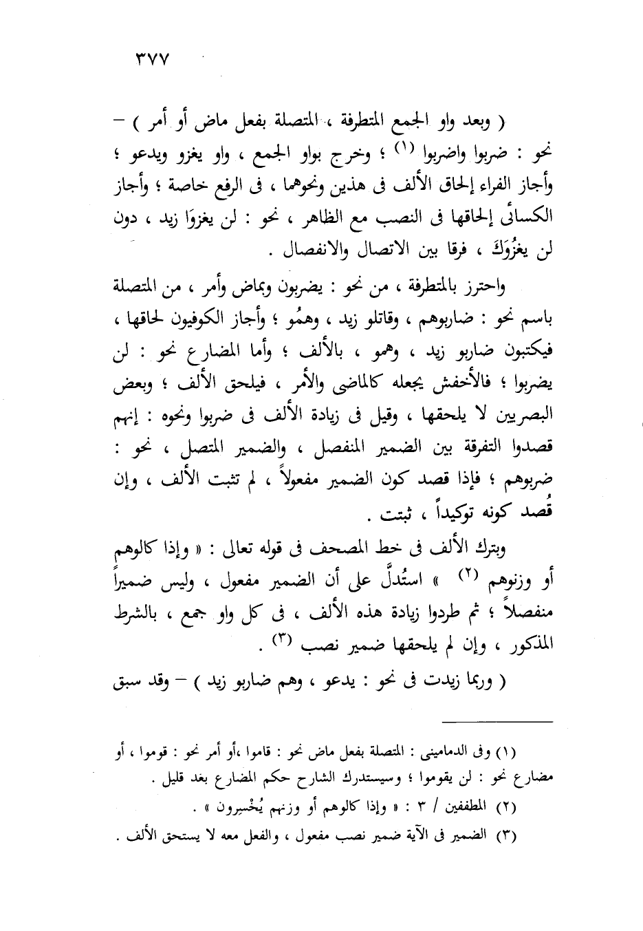 وبترك الألف في خط المصحف في قوله تعالى: "وإذا كالوهم أو وزنوهم" استدل على أن الضمير مفعول، وليس ضميراً منفصلاً؛ ثم طردوا زيادة هذه الألف، في كل واو جمع، بالشرط المذكور، وإن لم يلحقها ضمير نصب.