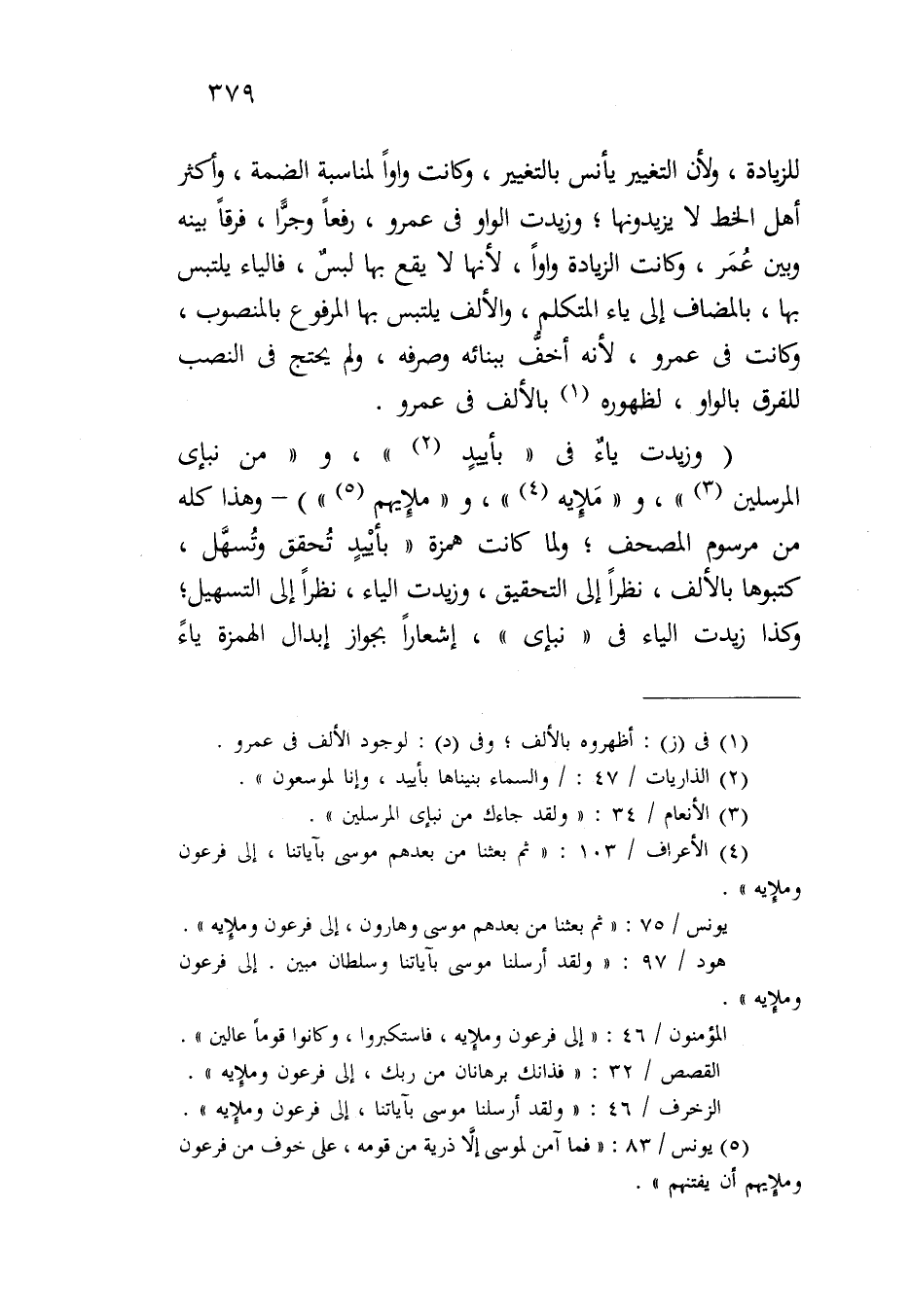(وزيدت ياء في "بأييد"، و"من نبإي المرسلين"، و"ملإيه"، و"ملإيهم") - وهذا كله من مرسوم المصحف؛ ولما كانت همزة "بأييد تحقق وتسهَّل، كتبوها بالألف، نظراً إلى التحقيق، وزيدت الياء، نظراً إلى التسهيل؛ وكذا زيدت الياء في "نبإي"، إشعاراً بجواز إبدال الهمزة ياء