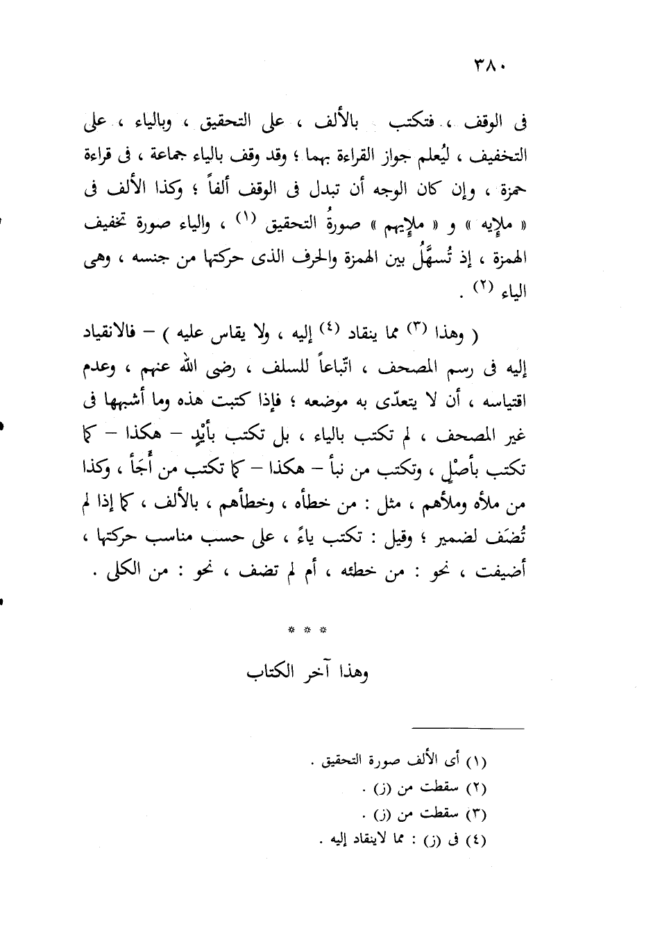 في الوقف، فتكتب بالألف، على التحقيق، وبالياء، على التخفيف، ليعلم جواز القراءة بهما؛ وقد وقف بالياء جماعة، في قراءة حمزة، وإن كان الوجه أن تبدل في الوقف ألفاً؛ وكذا الألف في "ملإيه" و"ملإيهم" صورة التحقيق، والياء صورة تخفيف الهمزة، إذ تُسهَّل بين الهمزة والحرف الذي حركتها من جنسه، وهي الياء.