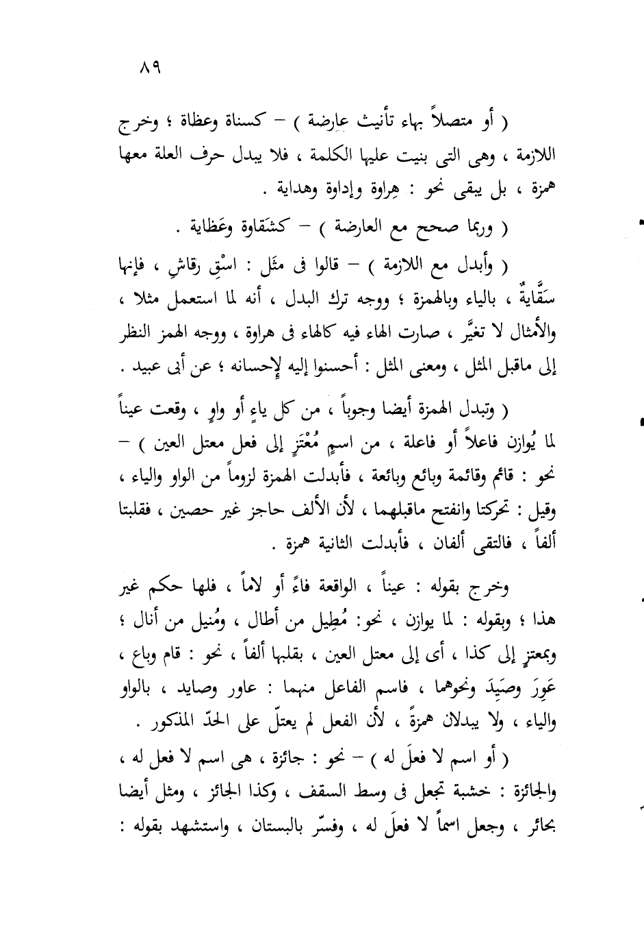 (أو متصلاً بهاء تأنيث عارضة) - كسناة وعظاة؛ وخرج اللازمة، وهي التي بنيت عليها الكلمة، فلا يبدل حرف العلة معها همزة، بل يبقى نحو: هراوة وإداوة وهداية.