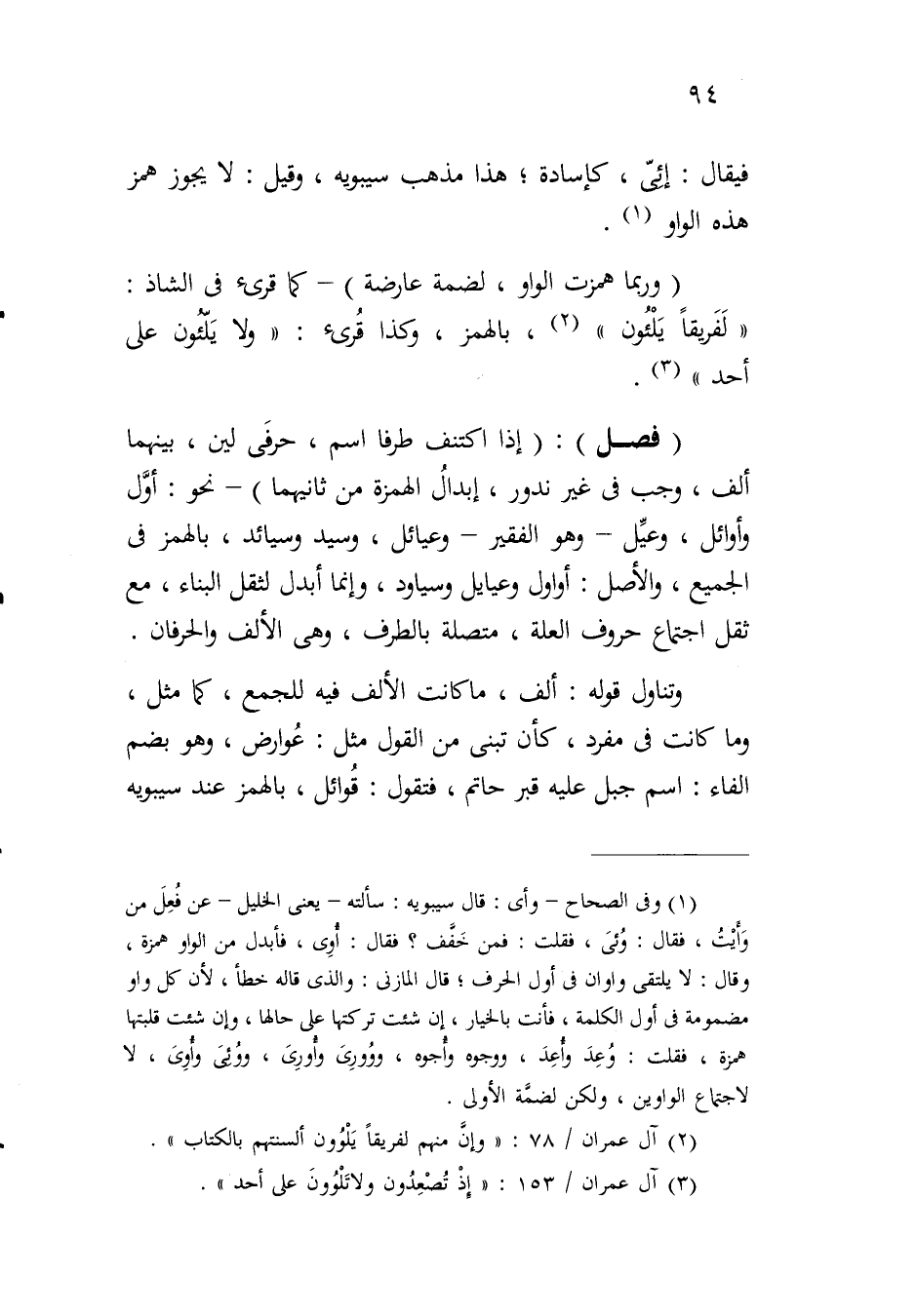 (وربما همزت الواو، لضمة عارضة) - كما قرئ في الشاذ: "لفريقاً يلئون"، بالهمز، وكذا قرئ: "ولا يلئون على أحد".