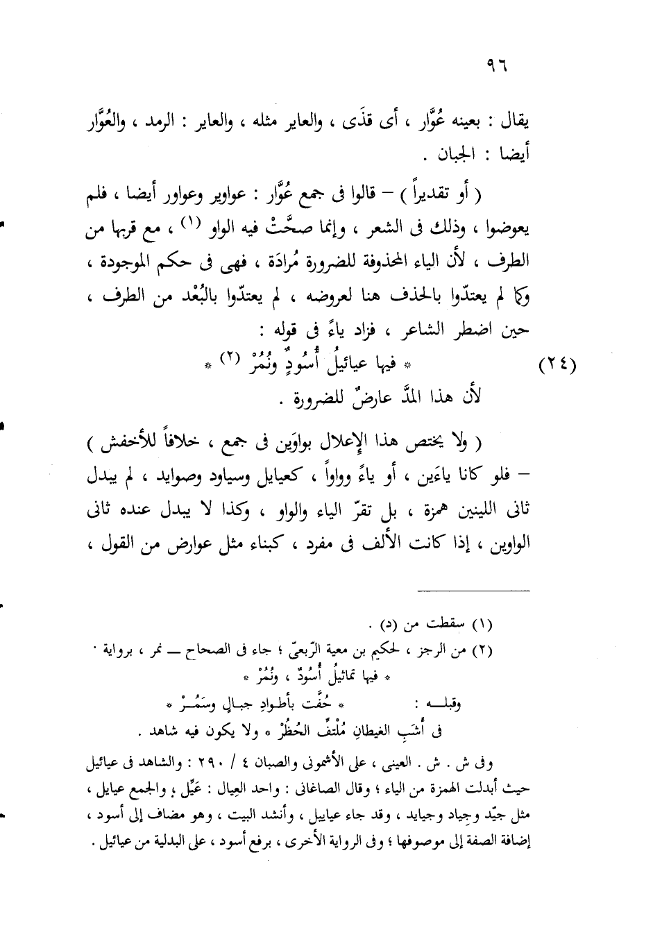 (أو تقديراً) - قالوا في جمع عوار: عواوير وعواور أيضاً، فلم يعوضوا، وذلك في الشعر، وإنما صحت فيه الواو، مع قربها من الطرف، لأن الياء المحذوفة للضرورة مرادة، فهي في حكم الموجودة، وكما لم يعتدوا بالحذف هنا لعروضه، لم يعتدوا بالبعد من الطرف، حين اضطر الشاعر، فزاد ياء في قوله: