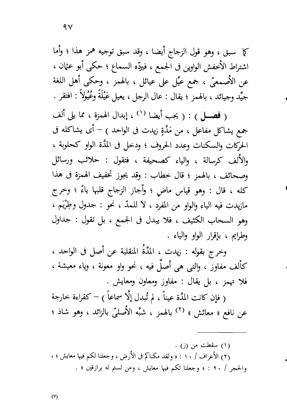 (فإن كانت المدة عيناً، لم تبدل إلا سماعاً) - كقراءة خارجة عن نافع "معائش" بالهمز، شبه الأصلي بالزائد، وهو شاذ؛