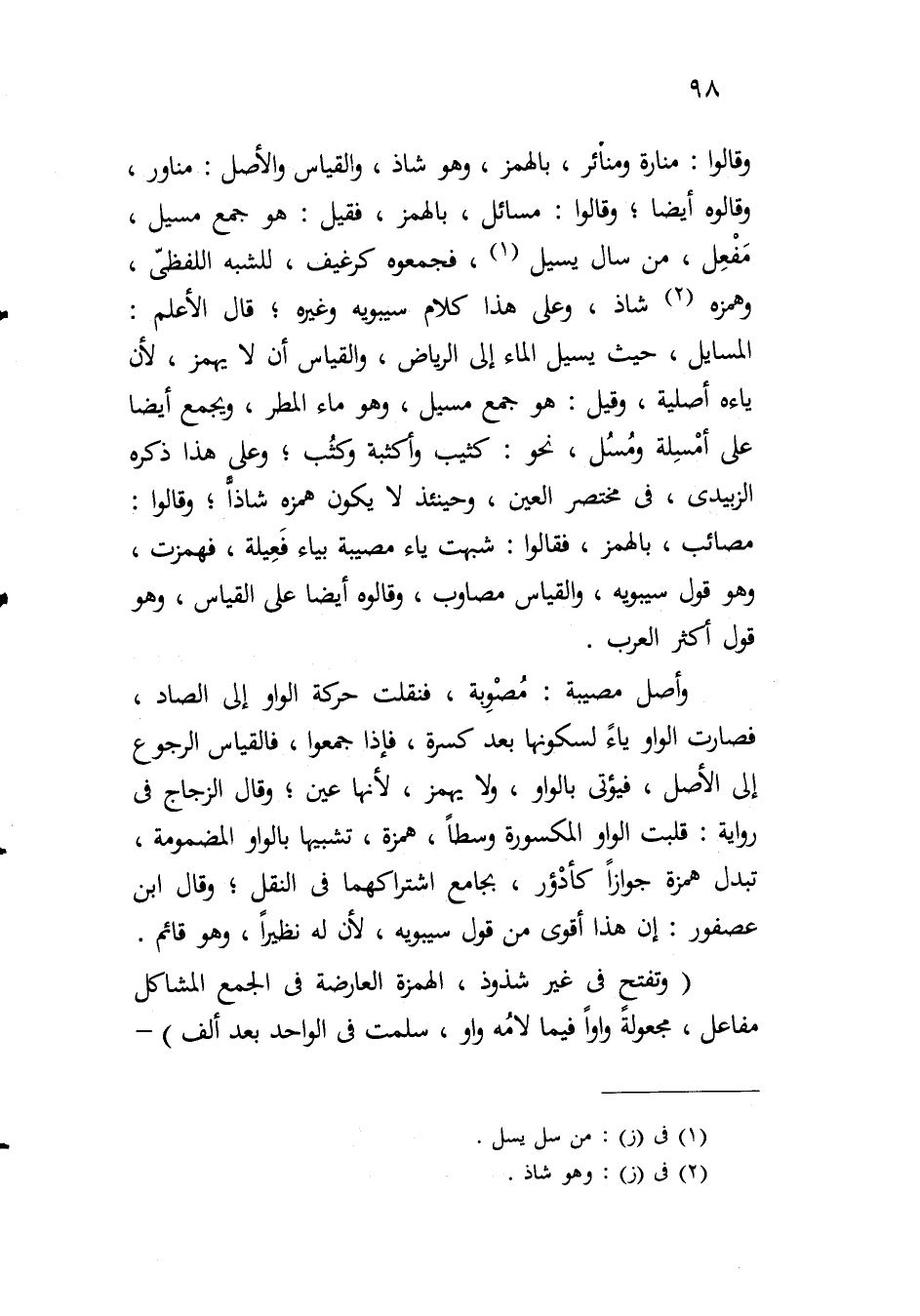 وقالوا: منارة ومنائر، بالهمز، وهو شاذ، والقياس والأصل: مناور، وقالوه أيضاً؛ وقالوا: مسائل، بالهمز، فقيل: هو جمع مسيل، مفعل، من سال يسيل، فجمعوه كرغيف، للشبه اللفظي، وهمزه شاذ، وعلى هذا كلام سيبويه وغيره؛ قال الأعلم: المسايل، حيث يسيل الماء إلى الرياض، والقياس أن لا يهمز، لن ياءه أصلية، وقيل: هو جمع مسيل، وهو ماء المطر، ويجمع ايضاً على أمسلة ومسل، نحو: كثيب وأكثبة وكثب؛ وعلى هذا ذكره الزبيدي، في مختصر العين، وحينئذ لا يكون همزه شاذاً؛ وقالوا: مصائب، بالهمز، فقالوا: شبهت ياء مصيبة بياء فعيلة، فهمزت، وهو قول سيبويه، والقياس مصاوب، وقالوه أيضاً على القياس، وهو قول أكثر العرب.