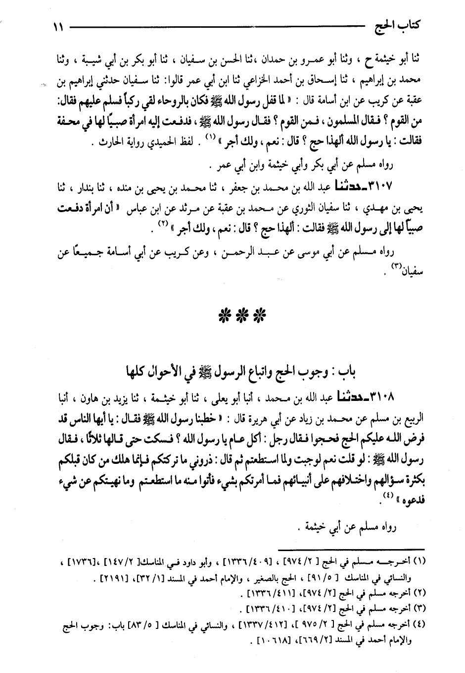 ثَنَا أَبُو خَيْثَمَةَ ح وثنا أَبُو عَمْرِو بْنُ حَمْدَانَ ثَنَا الْحَسَنُ بْنُ سُفْيَانَ ثَنَا أَبُو بَكْرِ بْنُ أَبِي شَيْبَةَ وثنا مُحَمَّدُ بْنُ إِبْرَاهِيمَ ثَنَا إِسْحَاقُ بْنُ أَحْمَدَ الْخُزَاعِيُّ ثَنَا ابْنُ أَبِي عُمَرَ قَالُوا ثَنَا سُفْيَانُ حَدَّثَنِي إِبْرَاهِيمُ بْنُ عُقْبَةَ عَنْ كُرَيْبٍ عَنِ ابْنِ أُسَامَةَ قَالَ (لَمَّا قَفَلَ رَسُولُ اللَّهِ صَلَّى اللَّهُ عَلَيْهِ وَسَلَّمَ فَكَانَ بِالرَّوْحَاءِ لَقِيَ رَكْبًا فَسَلَّمَ عَلَيْهِمْ فَقَالَ مَنِ الْقَوْمُ فَقَالَ الْمُسْلِمُونَ فَمَنِ الْقَوْمِ فَقَالَ رَسُولُ اللَّهِ صَلَّى اللَّهُ عَلَيْهِ وَسَلَّمَ فَدَفَعَتْ إِلَيْهِ امْرَأَةٌ صَبِيًّا لَهَا فِي مِحَفَّةٍ فَقَالَتْ يَا رَسُولَ اللَّهِ أَلِهَذَا حَجٌّ قَالَ نَعَمْ وَلَكِ أَجْرٌ) لَفْظُ الْحُمَيْدِيِّ رِوَايَةُ الْحَارِثِ