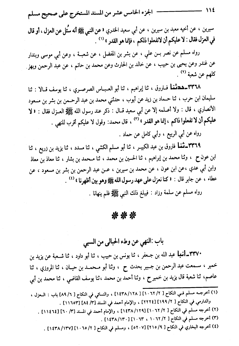 3369 - ثَنَا فَارُوقُ بْنُ عَبْدِ الْكَبِيرِ ثَنَا أَبُو مُسْلِمٍ الْكَشِّيُّ ثَنَا مُسَدَّدٌ ثَنَا يَزِيدُ بْنُ زُرَيْعٍ ثَنَا ابْنُ عَوْنٍ ح وَثَنَا مُحَمَّدُ بْنُ إِبْرَاهِيمَ ثَنَا الْحُسَيْنُ بْنُ مُحَمَّدٍ ثَنَا مُحَمَّدُ بْنُ بَشَّارٍ ثَنَا مُعَاذُ بْنُ مُعَاذٍ وَابْنُ أَبِي عَدِيٍّ عَنِ ابْنِ عَوْنٍ عَنْ مُحَمَّدِ بْنِ سِيرِينَ عَنْ عَبْدِ الرَّحْمَنِ بْنِ بِشْرِ بْنِ مَسْعُودٍ عَنْ عَطَاءٍ عَنْ جَابِرٍ قَالَ (كُنَّا نَعْزِلُ عَلَى عَهْدِ رَسُولِ اللَّهِ صَلَّى اللَّهُ عَلَيْهِ وَسَلَّمَ وَهُوَ بَيْنَ أَظْهُرِنَا)