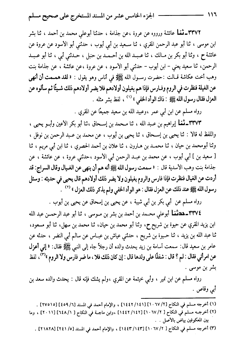 3372 - ثَنَا عَائِشَةُ وَرَوَوْهُ عَنْ عُرْوَةَ عَنْ جُذَامَةَ حَدَّثَنَا أَبُو عَلِيٍّ مُحَمَّدُ بْنُ أَحْمَدَ ثَنَا بِشْرُ ابْن مُوسَى ثَنَا أَبُو عَبْدِ الرَّحْمَنِ الْمُقْرِيُّ ثَنَا سَعِيدُ بْنُ أَبِي أَيُّوبَ حَدَّثَنِي أَبُو الأَسْوَدِ عَنْ عُرْوَةَ عَنْ عَائِشَةَ ح وَثنا أَبُو بَكْرِ بْنُ مَالِكٍ ثَنَا عَبْدُ اللَّهِ بْنُ أَحْمَدَ بْنِ حَنْبَلٍ حَدَّثَنِي أَبِي ثَنَا أَبُو عَبْدِ الرَّحْمَنِ ثَنَا سَعِيدٌ يَعْنِي ابْنَ أَيُّوبَ حَدَّثَنِي أَبُو الأَسْوَدِ عَنْ عُرْوَةَ عَنْ عَائِشَةَ عَنْ جُذَامَةَ بِنْتِ وَهْبٍ أُخْتِ عُكَاشَةَ قَالَتْ حَضَرْتُ رَسُولَ اللَّهِ صَلَّى اللَّهُ عَلَيْهِ وَسَلَّمَ فِي أُنَاسٍ وَهُوَ يَقُولُ (لَقَدْ هَمَمْتُ أَنْ أَنْهَى عَنِ الْغِيلَةِ فَنَظَرْتُ فِي الرُّومِ وَفَارِسَ فَإِذَا هُمْ يُغِيلُونَ أَوْلادَهُمْ فَلا يَضُرُّ أَوْلادَهُمْ ذَلِكَ شَيْئًا ثُمَّ سَأَلُوهُ عَنِ الْعَزْلِ فَقَالَ رَسُولُ اللَّهِ صَلَّى اللَّهُ عَلَيْهِ وَسَلَّمَ ذَاكَ الْوَأْدُ الْخَفِيُّ) لَفْظُ بِشْرٍ مِثْلُهُ