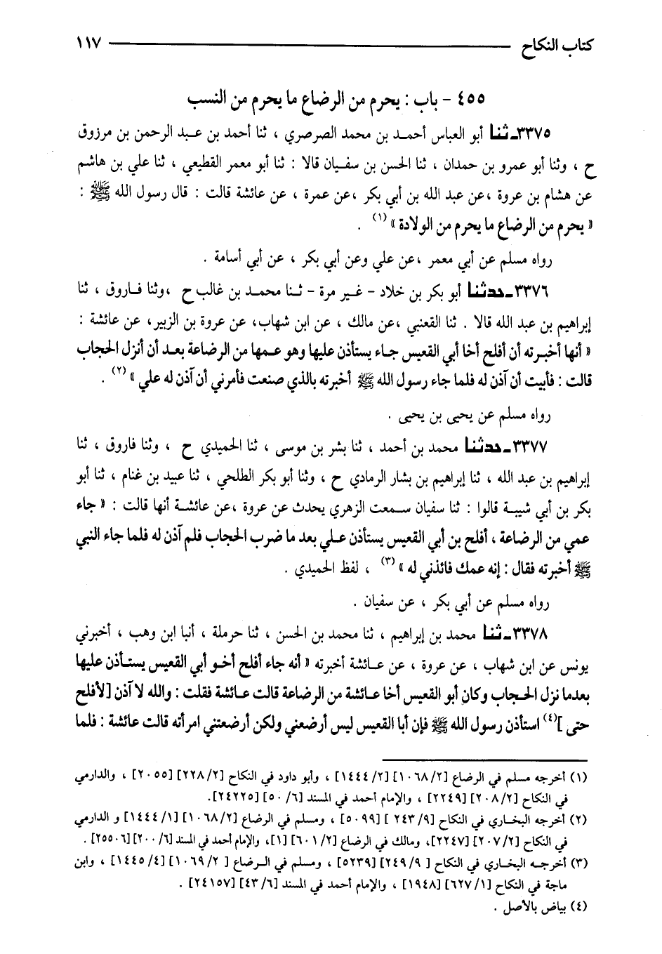 3377 - حَدَّثَنَا مُحَمَّدُ بْنُ أَحْمَدَ ثَنَا بِشْرُ بْنُ مُوسَى ثَنَا الْحُمَيْدِيُّ ح وثنا فَارُوقٌ ثَنَا إِبْرَاهِيمُ بْنُ عَبْدِ اللَّهِ ثَنَا إِبْرَاهِيمُ بْنُ بَشَّارٍ الرَّمَادِيُّ ح وَثنا أَبُو بَكْرٍ الطَّلْحِيُّ ثَنَا عُبَيْدُ بْنُ غَنَّامٍ ثَنَا أَبُو بَكْرِ بْنُ أَبِي شَيْبَةَ قَالُوا ثَنَا سُفْيَانُ سَمِعْتُ الزُّهْرِيَّ يُحَدِّثُ عَنْ عُرْوَةَ عَنْ عَائِشَةَ أَنَّهَا قَالَتْ (جَاءَ عَمِّي مِنَ الرَّضَاعَةِ أَفْلَحُ بْنُ أَبِي الْقُعَيْسِ يَسْتَأْذِنُ عَلَيَّ بَعْدَ مَا ضُرِبَ الْحِجَابُ فَلَمْ آذَنْ لَهُ فَلَمَّا جَاءَ النَّبِيِّ صَلَّى اللَّهُ عَلَيْهِ وَسَلَّمَ أَخْبَرْتُهُ فَقَالَ إِنَّهُ عَمُّكِ فَائْذَنِي لَهُ) لَفْظُ الْحُمَيْدِيِّ