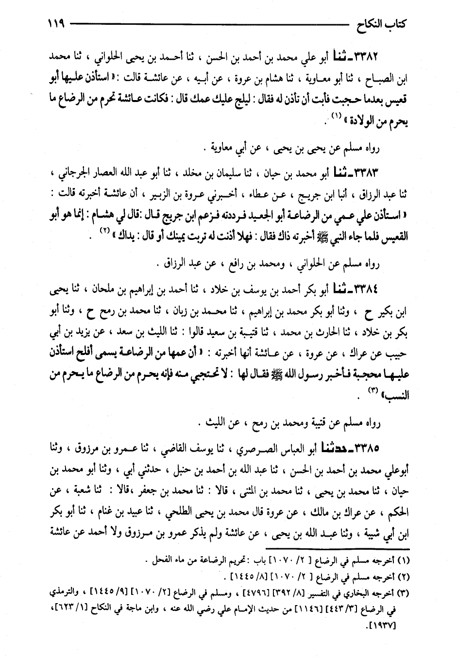 3382 - ثَنَا أَبُو عَلِيٍّ مُحَمَّدُ بْنُ أَحْمَدَ بْنِ الْحَسَنِ ثَنَا أَحْمَدُ بْنُ يَحْيَى الْحُلْوَانِيُّ ثَنَا مُحَمَّدٌ ابْن الصَّبَّاحِ ثَنَا أَبُو مُعَاوِيَةَ ثَنَا هِشَامِ بْنِ عُرْوَةَ عَنْ أَبِيهِ عَنْ عَائِشَةَ قَالَتْ (اسْتَأْذَنَ عَلَيْهَا أَبُو قُعَيْسٍ بَعْدَمَا حُجِبَتْ فَأَبَتْ أَنْ تَأْذَنَ لَهُ فَقَالَ لِيَلِجْ عَلَيْكِ عَمُّكِ قَالَ فَكَانَتْ عَائِشَةُ تُحَرِّمُ مِنَ الرَّضَاعِ مَا يُحَرَّمُ مِنَ الْوِلادَةِ)