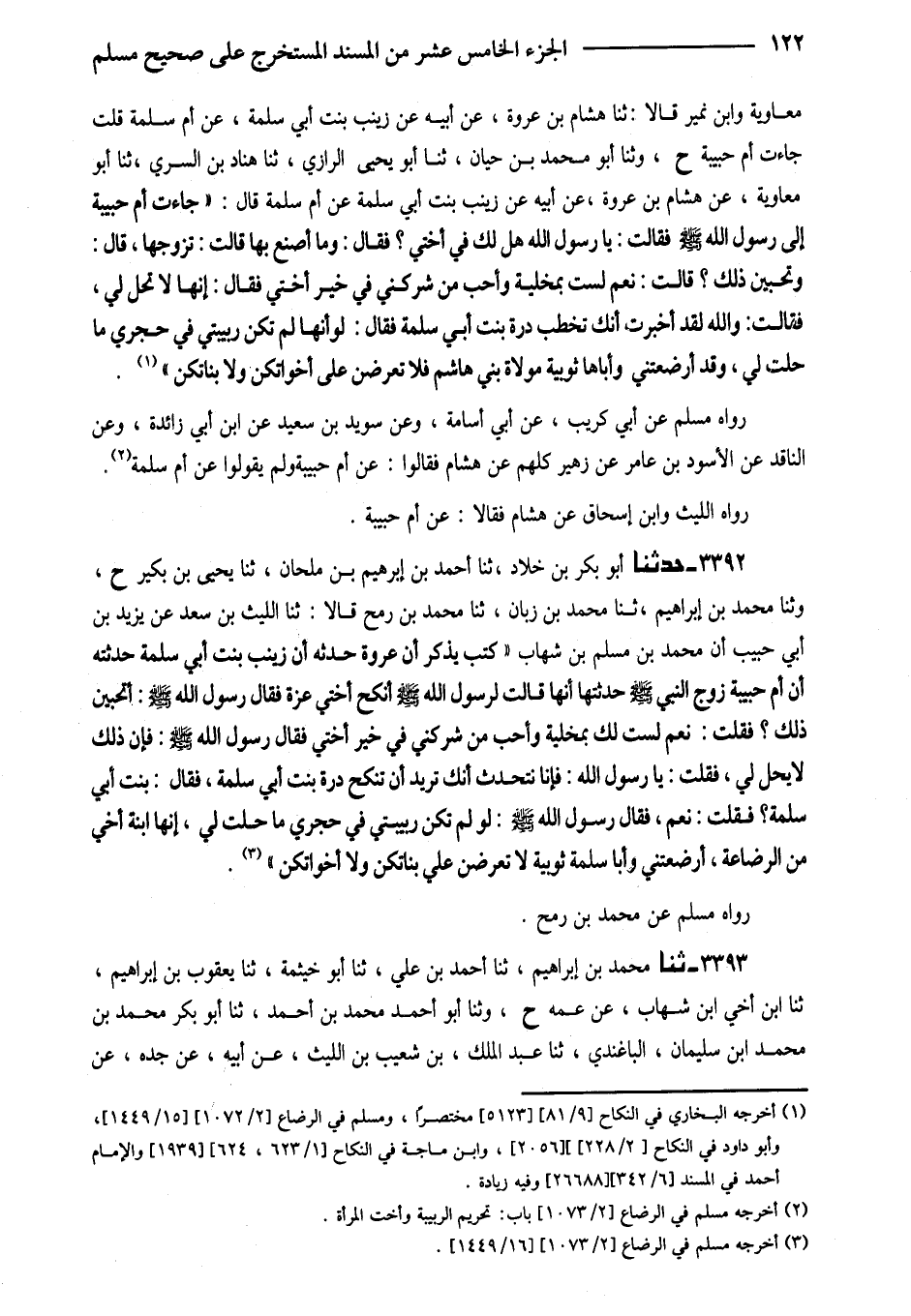 رَوَاهُ مُسْلِمٌ عَنْ أَبِي كُرَيْبٍ عَنْ أَبِي أُسَامَةَ وَعَنْ سُوَيْدِ بْنِ سَعِيدٍ عَنِ ابْنِ أَبِي زَائِدَةَ وَعَنِ النَّاقِدِ عَنِ الأَسْوَدِ بْنِ عَامِرٍ عَنْ زُهَيْرٍ كُلُّهُمْ عَنْ هِشَامٍ فَقَالُوا عَنْ أُمِّ حَبِيبَةٍ وَلَمْ يَقُولُوا عَنْ أُمِّ سَلَمَةَ