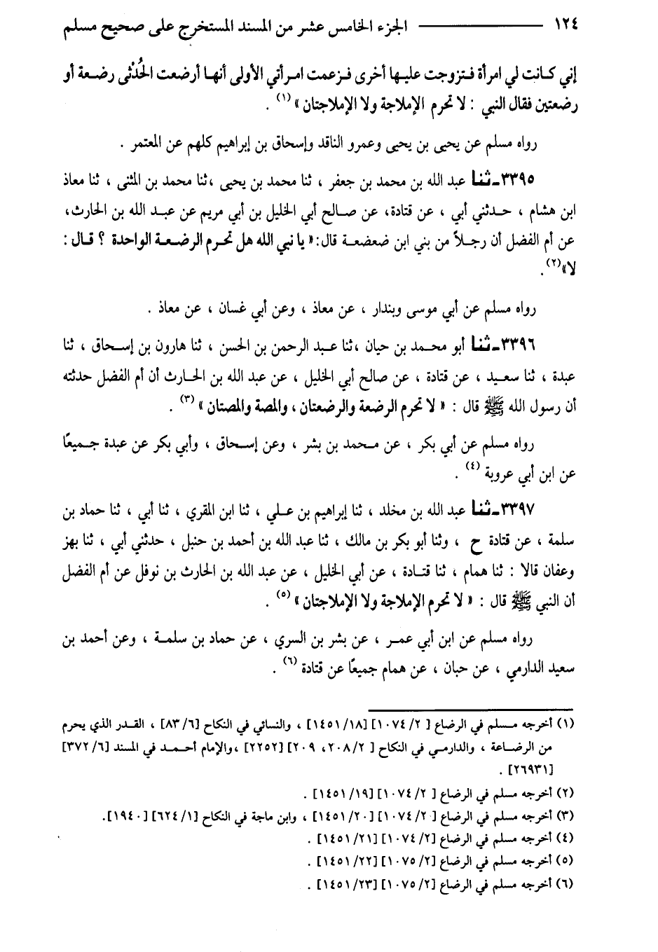 3397 - ثَنَا عَبْدُ اللَّهِ بْنُ مَخْلَدٍ ثَنَا إِبْرَاهِيمُ بْنُ عَلِيٍّ ثَنَا ابْنُ الْمُقْرِيِّ ثَنَا أَبِي ثَنَا حَمَّادُ بْنُ سَلَمَةَ عَنْ قَتَادَةَ ح وثنا أَبُو بَكْرِ بْنُ مَالِكٍ ثَنَا عَبْدُ اللَّهِ بْنُ أَحْمَدَ بْنِ حَنْبَلٍ حَدَّثَنِي أَبِي ثَنَا بَهْزٌ وَعَفَّانُ قَالا ثَنَا هَمَّامٌ ثَنَا قَتَادَةُ عَنْ أَبِي الْخَلِيلِ عَنْ عَبْدِ اللَّهِ بْنِ الْحَارِثِ بْنِ نَوْفَلٍ عَنْ أُمِّ الْفَضْلِ إِنَّ النَّبِيَّ صَلَّى اللَّهُ عَلَيْهِ وَسَلَّمَ قَالَ (لَا تُحَرِّمُ الْإِمْلاجَةُ وَلا الْإِمْلاجَتَانِ)