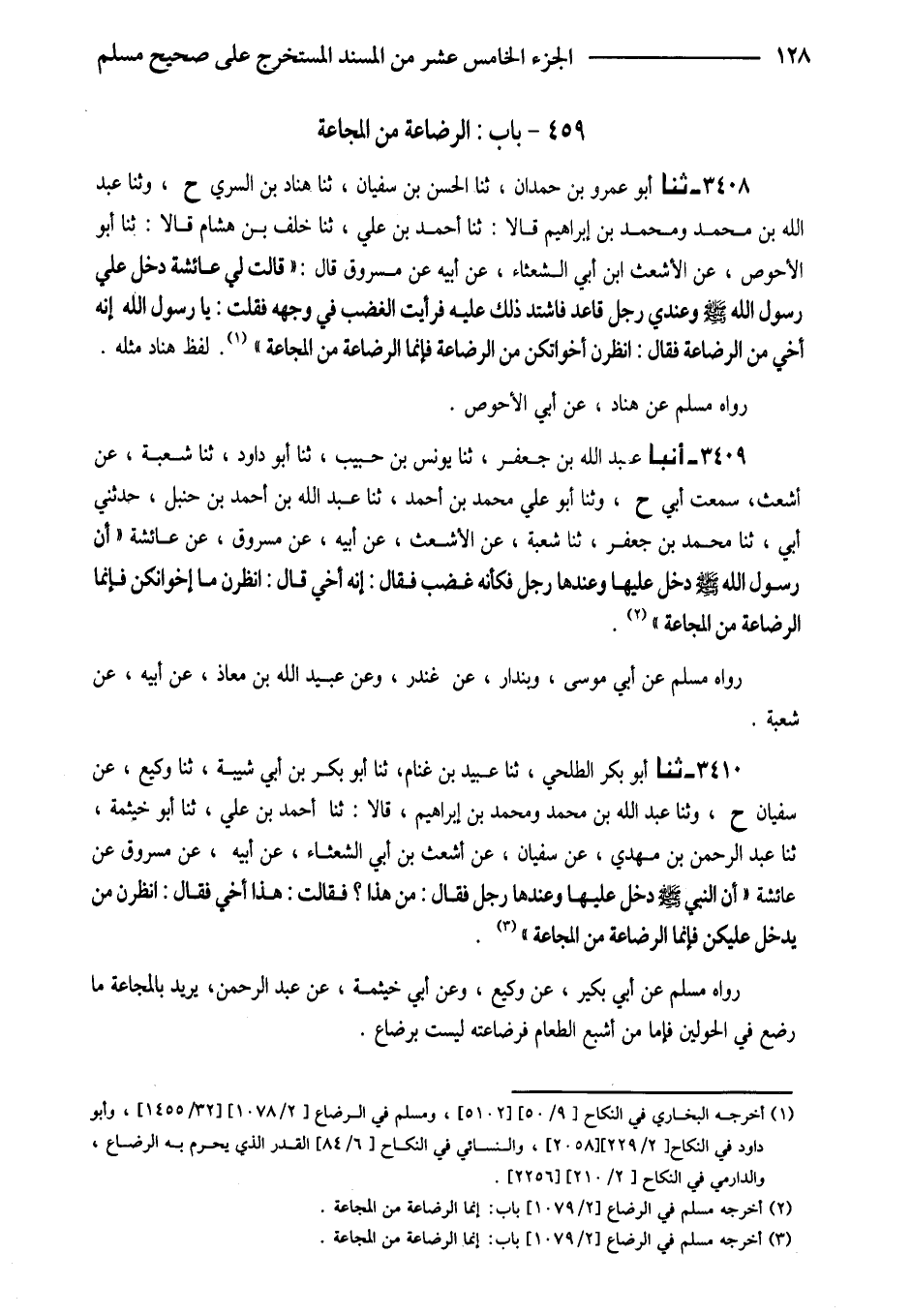 3408 - ثَنَا أَبُو عَمْرِو بْنُ حَمْدَانَ ثَنَا الْحَسَنُ بْنُ سُفْيَانَ ثَنَا هَنَّادٌ بْنُ السَّرِيِّ ح وَثنا عَبْدُ اللَّهِ بْنُ مُحَمَّدٍ وَمُحَمَّدُ بْنُ إِبْرَاهِيمَ قَالا ثَنَا أَحْمَدُ بْنُ عَلِيٍّ ثَنَا خَلَفُ بْنُ هِشَامٍ قَالا ثَنَا أَبُو الأَحْوَصِ عَنْ الْأَشْعَث ابْن أَبِي الشَّعْثَاءِ عَنْ أَبِيهِ عَنْ مَسْرُوقٍ قَالَ (قَالَتْ لِي عَائِشَةُ دَخَلَ عَلَى رَسُولِ اللَّهِ صَلَّى اللَّهُ عَلَيْهِ وَسَلَّمَ وَعِنْدِي رَجُلٌ قَاعِدٌ فَاشْتَدَّ ذَلِكَ عَلَيْهِ فَرَأَيْتُ الْغَضَبَ فِي وَجْهِهِ فَقُلْتُ يَا رَسُولَ اللَّهِ إِنَّهُ أَخِي مِنَ الرضَاعَة فَقَالَ انظرن اخواتكن مِنَ الرَّضَاعَةِ فَإِنَّمَا الرَّضَاعَةُ مِنَ الْمَجَاعَةِ) لَفْظُ هَنَّادٍ مِثْلُهُ