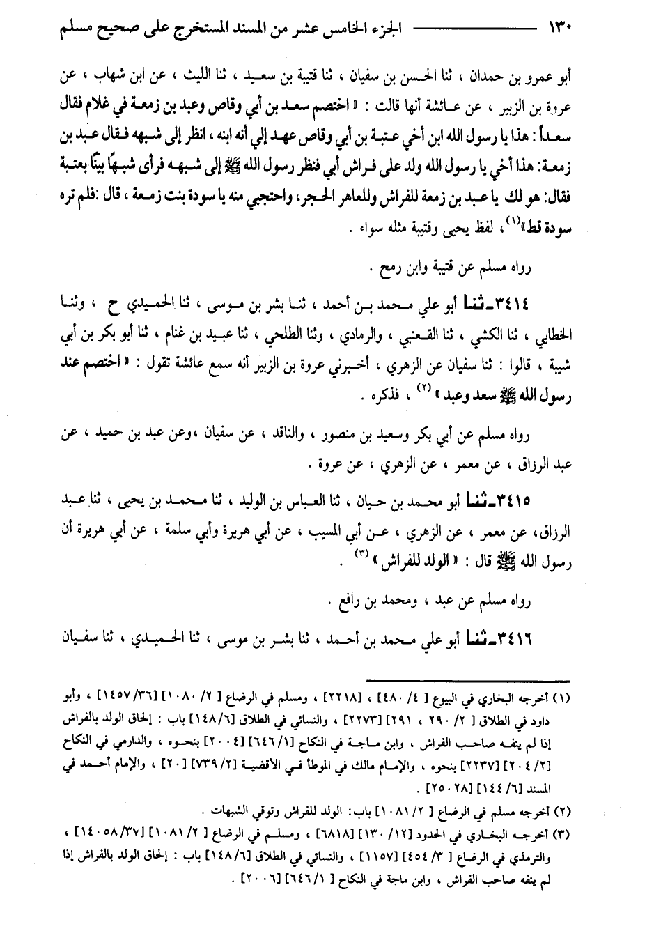 أَبُو عَمْرِو بْنُ حَمْدَانَ ثَنَا الْحَسَنُ بْنُ سُفْيَانَ ثَنَا قُتَيْبَةُ بْنُ سَعِيدٍ ثَنَا اللَّيْثُ عَنْ ابْنِ شِهَابٍ عَنْ عُرْوَةَ بْنِ الزُّبَيْرِ عَنْ عَائِشَةَ أَنَّهَا قَالَتْ (اخْتَصَمَ سَعْدُ بْنُ أَبِي وَقَّاصٍ وَعَبْدُ بْنُ زُمْعَةَ فِي غُلامٍ فَقَالَ سَعْدا هَذَا يَا رَسُولَ اللَّهِ ابْنُ أَخِي عُتْبَةَ بْنِ أَبِي وَقَّاصٍ عَهِدَ إِلَيَّ أَنَّهُ ابْنُهُ انْظُرْ إِلَى شَبَهِهِ فَقَالَ عَبْدُ بْنُ زُمْعَةَ هَذَا أَخِي يَا رَسُولَ اللَّهِ وُلِدَ عَلَى فِرَاشِ أَبِي فَنَظَرَ رَسُولُ اللَّهِ صَلَّى اللَّهُ عَلَيْهِ وَسَلَّمَ إِلَى شَبَهِهِ فَرَأَى شَبَهًا بَيِّنًا بِعُتْبَةَ فَقَالَ هُوَ لَكَ يَا عَبْدُ بْنُ زَمْعَةَ لِلْفِرَاشِ وَلِلْعَاهِرِ الْحَجَرُ وَاحْتَجِبِي مِنْهُ يَا سَوْدَةُ بِنْتُ زُمْعَةَ قَالَ فَلَمْ تَرَهُ سَوْدَةُ قَطُّ) لَفْظُ يَحْيَى وَقُتَيْبَةَ مِثْلُهُ سَوَاءٌ