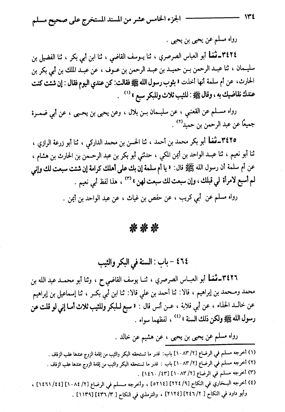 3424 - ثَنَا أَبُو الْعَبَّاسِ الصَّرْصَرِيُّ ثَنَا يُوسُفُ الْقَاضِي ثَنَا ابْنُ أَبِي بَكْرٍ ثَنَا الْفُضَيْلُ بْنُ سُلَيْمَانَ ثَنَا عَبْدُ الرَّحْمَنِ بْنُ حُمَيْدِ بْنِ عَبْدِ الرَّحْمَنِ بْنِ عَوْفٍ عَنْ عَبْدِ الْمَلِكِ بْنُ أَبِي بَكْرِ بْنِ الْحَارِثِ عَنْ أُمِّ سَلَمَةَ أَنَّهَا أَخَذَتْ (بِثَوْبِ رَسُولِ اللَّهِ صَلَّى اللَّهُ عَلَيْهِ وَسَلَّمَ فَقَالَتْ كُنْ عِنْدِي الْيَوْمَ فَقَالَ إِنْ شِئْتِ كُنْتُ عِنْدَكِ نُقَاضِيكِ بِهِ وَقَالَ صَلَّى اللَّهُ عَلَيْهِ وَسَلَّمَ لِلثَّيِّبِ ثَلاثٌ وَلِلْبِكْرِ سَبْعٌ)