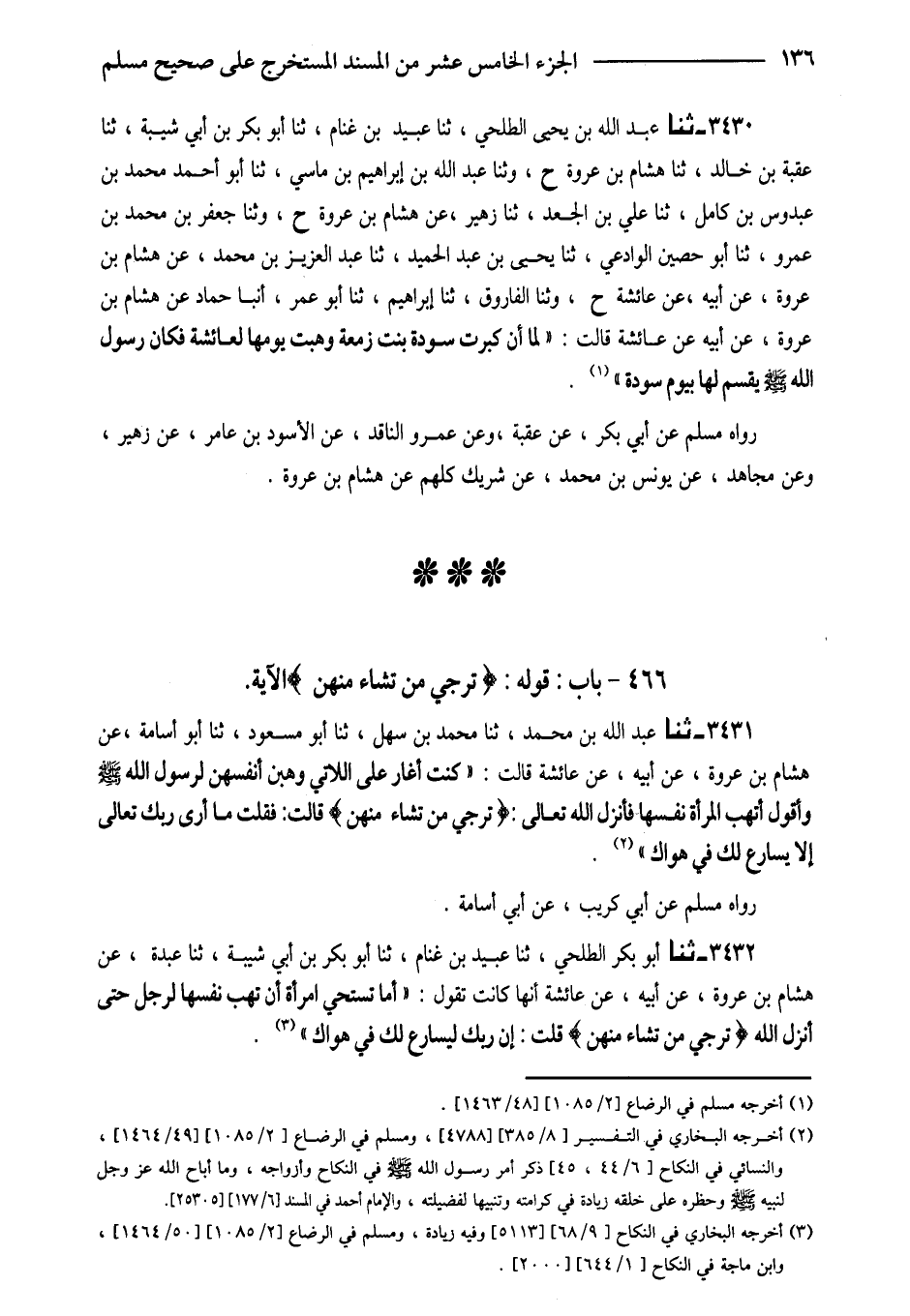 3430 - ثَنَا عَبْدُ اللَّهِ بْنُ يَحْيَى الطَّلْحِيُّ ثَنَا عُبَيْدُ بْنُ غَنَّامٍ ثَنَا أَبُو بَكْرِ بْنُ أَبِي شَيْبَةَ ثَنَا عُقْبَةُ بْنُ خَالِدٍ ثَنَا هِشَامِ بْنِ عُرْوَةَ ح وثنا عَبْدِ اللَّهِ بْنِ إِبْرَاهِيمَ بْنِ مَاسِيٍّ ثَنَا أَبُو أَحْمَدَ مُحَمَّدُ بْنُ عَبْدُوسِ بْنِ كَامِلٍ ثَنَا عَلِيُّ بْنُ الْجَعْدِ ثَنَا زُهَيْرٌ عَنْ هِشَامِ بْنِ عُرْوَةَ ح وَثَنَا جَعْفَرُ بْنُ مُحَمَّدِ بْنِ عَمْرٍو ثَنَا أَبُو حُصَيْنٍ الْوَادِعِيُّ ثَنَا يَحْيَى بْنُ عَبْدِ الْحَمِيدِ ثَنَا عَبْدُ الْعَزِيزِ بْنُ مُحَمَّدٍ عَنْ هِشَامِ بْنِ عُرْوَةَ عَنْ أَبِيهِ عَنْ عَائِشَةَ ح وثنا الْفَارُوقُ ثَنَا إِبْرَاهِيمُ ثَنَا أَبُو عُمَرَ أَنْبَأَ حَمَّادٌ عَنْ هِشَامِ بْنِ عُرْوَةَ عَنْ أَبِيهِ عَنْ عَائِشَةَ قَالَتْ (لَمَّا أَنْ كَبِرَتْ سَوْدَةُ بِنْتُ زَمْعَةَ وَهَبَتْ يَوْمَهَا لِعَائِشَةَ فَكَانَ رَسُولُ اللَّهِ صَلَّى اللَّهُ عَلَيْهِ وَسَلَّمَ يَقْسِمُ لَهَا بِيَوْمِ سَوْدَةَ)