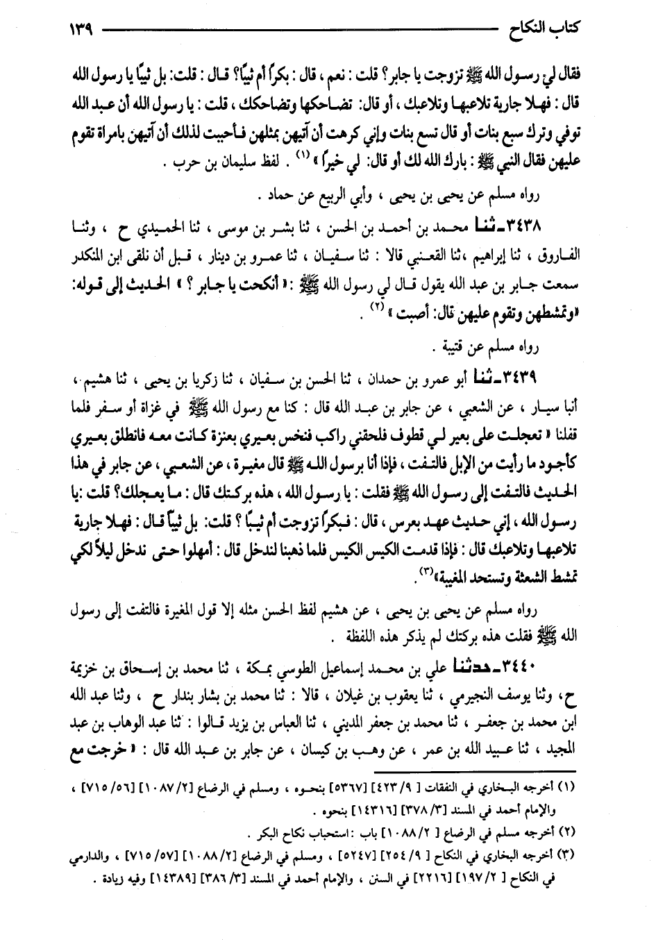 3438 - ثَنَا مُحَمَّدُ بْنُ أَحْمَدَ بْنِ الْحَسَنِ ثَنَا بِشْرُ بْنُ مُوسَى ثَنَا الْحُمَيْدِيُّ ح وَثنا الْفَارُوقُ ثَنَا إِبْرَاهِيمُ ثَنَا الْقَعْنَبِيُّ قَالا ثَنَا سُفْيَانُ ثَنَا عَمْرُو بْنُ دِينَارٍ قَبْلَ أَنْ نَلْقَى ابْنَ الْمُنْكَدِرِ سَمِعْتُ جَابِرَ بْنَ عَبْدِ اللَّهِ يَقُولُ قَالَ لِي رَسُولُ اللَّهِ صَلَّى اللَّهُ عَلَيْهِ وَسَلَّمَ (أَنَكَحْتَ يَا جَابِرُ) الْحَدِيثَ إِلَى قَوْلِهِ (وَتُمَشِّطُهُنَّ وَتَقُومُ عَلَيْهِنَّ قَالَ أَصَبْتَ)