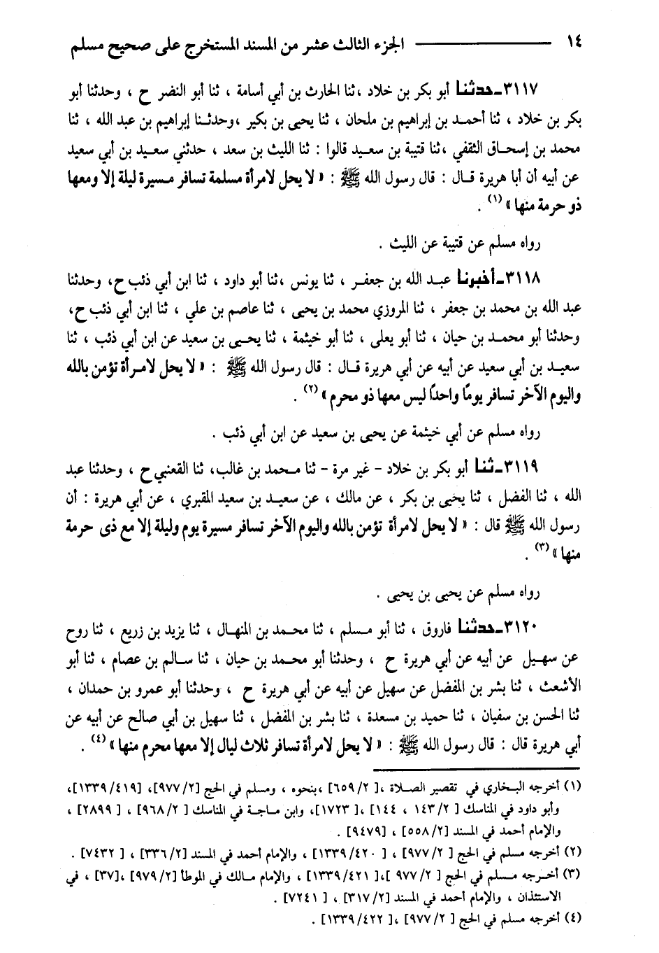 3117 - حَدَّثَنَا أَبُو بَكْرِ بْنُ خَلادٍ ثَنَا الْحَارِثُ بْنُ أَبِي أُسَامَةَ ثَنَا أَبُو النَّضْرِ ح وَحَدَّثَنَا أَبُو بَكْرِ بْنُ خَلادٍ ثَنَا أَحْمَدُ بْنُ إِبْرَاهِيمَ بْنِ مِلْحَانَ ثَنَا يَحْيَى بْنُ بُكَيْرٍ وَحَدَّثَنَا إِبْرَاهِيمُ بْنُ عَبْدِ اللَّهِ ثَنَا مُحَمَّدُ بْنُ إِسْحَاقَ الثَّقَفِيُّ ثَنَا قُتَيْبَةُ بْنُ سَعِيدٍ قَالُوا ثَنَا اللَّيْثُ بْنُ سَعْدٍ حَدَّثَنِي سَعِيدُ بْنُ أَبِي سَعِيدٍ عَنْ أَبِيهِ أَنَّ أَبَا هُرَيْرَةَ قَالَ قَالَ رَسُولُ اللَّهِ صَلَّى اللَّهُ عَلَيْهِ وَسَلَّمَ (لَا يَحِلُّ لِامْرَأَةٍ مُسْلِمَةٍ تُسَافِرُ مَسِيرَةَ لَيْلَةٍ إِلَّا وَمَعَهَا ذُو حُرْمَةٍ مِنْهَا)