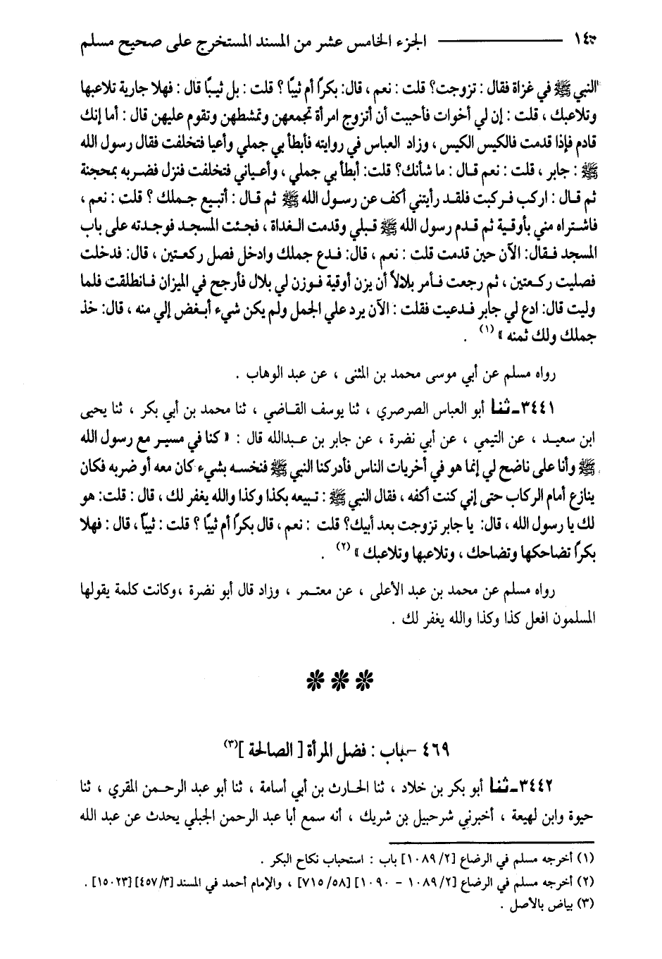 النَّبِيُّ صَلَّى اللَّهُ عَلَيْهِ وَسَلَّمَ فِي غَزَاةٍ فَقَالَ تَزَوَّجْتَ قُلْتُ نَعَمْ قَالَ بِكْرًا أَمْ ثَيِّبًا قُلْتُ بَلْ ثَيِّبًا قَالَ فَهَلَّا جَارِيَةً تُلاعِبُهَا وَتُلاعِبُكَ قُلْتُ إِنَّ لِي أَخَوَاتٍ فَأَحْبَبْتُ أَنْ أَتَزَوَّجَ امْرَأَةً تَجْمَعُهُنَّ وَتُمَشِّطُهُنَّ وَتَقُومُ عَلَيْهِنَّ قَالَ أَمَا إِنَّكَ قَادِمٌ فَإِذَا قَدِمْتَ فَالْكَيْسَ الْكَيْسَ وَزَادَ الْعَبَّاسُ فِي رِوَايَتِهِ فَأَبْطَأَ بِي جَمَلِي وَأَعْيَا فَتَخَلَّفْتُ فَقَالَ رَسُولُ اللَّهِ صَلَّى اللَّهُ عَلَيْهِ وَسَلَّمَ جَابِرُ قُلْتُ نَعَمْ قَالَ مَا شَأْنُكَ قُلْتُ أَبْطَأَ بِي جَمَلِي وَأَعْيَانِي فَتَخَلَّفْتُ فَنَزَلَ فَضَرَبَهُ بِمِحْجَنِهِ ثُمَّ قَالَ ارْكَبْ فَرَكِبْتُ فَلَقَدْ رَأَيْتَنِي أَكُفُّ عَنْ رَسُولِ اللَّهِ صَلَّى اللَّهُ عَلَيْهِ وَسَلَّمَ ثُمَّ قَالَ أَتَبِيعُ جَمَلَكَ قُلْتُ نَعَمْ فَاشْتَرَاهُ مِنِّي بِأُوقِيَّةٍ ثُمَّ قَدِمَ رَسُولُ اللَّهِ صَلَّى اللَّهُ عَلَيْهِ وَسَلَّمَ قَبْلِي وَقَدِمْتُ الْغَدَاةَ فَجِئْتُ الْمَسْجِدَ فَوَجَدْتُهُ عَلَى بَابِ الْمَسْجِدِ فَقَالَ الْآنَ حِينَ قَدِمْتُ قُلْتُ نَعَمْ قَالَ فَدَعْ جَمَلَكَ وَادْخُلْ فَصَلِّ رَكْعَتَيْنِ قَالَ فَدَخَلْتُ فَصَلَّيْتُ رَكْعَتَيْنِ ثُمَّ رَجَعْتُ فَأَمَرَ بِلالا أَنْ يَزِنَ أُوقِيَّةً فَوَزَنَ لِي بِلالٌ فَأَرْجَحَ فِي الْمِيزَانِ فَانْطَلَقْتُ فَلَمَّا وَلَّيْتُ قَالَ ادْعُ لِي جَابر فَدُعِيتُ فَقُلْتُ الْآنَ يَرُدُّ عَلَيَّ الْجَمَلَ وَلَمْ يَكُنْ شَيْءٌ أَبْغَضَ إِلِيَّ مِنْهُ قَالَ خُذْ جَمَلَكَ وَلَكَ ثَمَنُهُ)