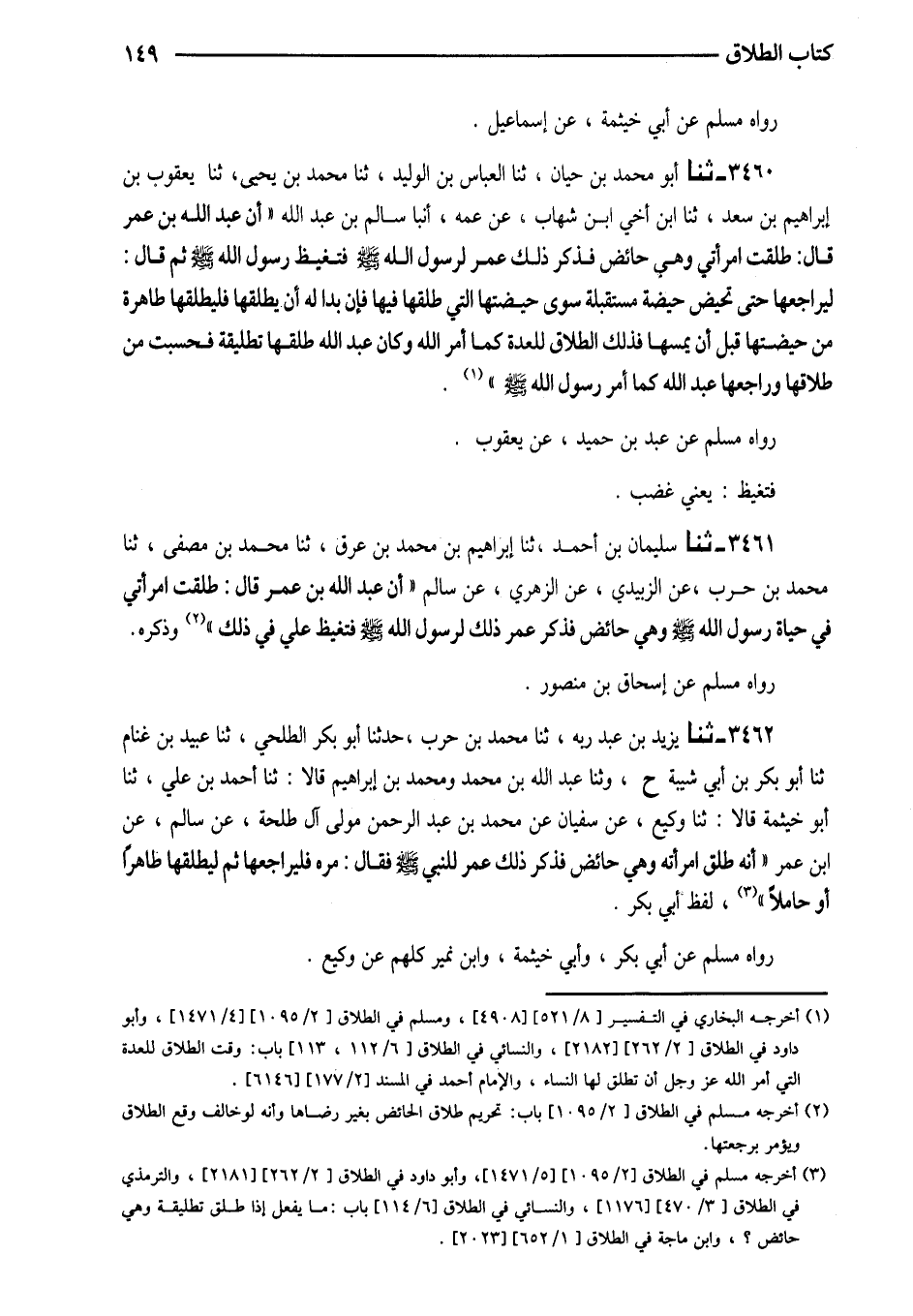 3462 - ثَنَا يَزِيدُ بْنُ عَبْدِ رَبِّهِ ثَنَا مُحَمَّدُ بْنُ حَرْبٍ حَدَّثَنَا أَبُو بَكْرٍ الطَّلْحِيُّ ثَنَا عُبَيْدُ بْنُ غَنَّامٍ ثَنَا أَبُو بَكْرِ بْنُ أَبِي شَيْبَةَ ح وَثَنَا عَبْدُ اللَّهِ بْنُ مُحَمَّدٍ وَمُحَمَّدُ بْنُ إِبْرَاهِيمَ قَالا ثَنَا أَحْمَدُ بْنُ عَلِيٍّ ثَنَا أَبُو خَيْثَمَةَ قَالا ثَنَا وَكِيعٌ عَنْ سُفْيَانَ عَنْ مُحَمَّدِ بْنِ عَبْدِ الرَّحْمَنِ مَوْلَى آلِ طَلْحَةَ عَنْ سَالِمٍ عَنِ ابْنِ عُمَرَ (أَنَّهُ طَلَّقَ امْرَأَتَهُ وَهِيَ حَائِضٌ فَذَكَرَ ذَلِكَ عُمَرُ لِلنَّبِيِّ صَلَّى اللَّهُ عَلَيْهِ وَسَلَّمَ فَقَالَ مُرْهُ فَلْيُرَاجِعْهَا ثُمَّ لِيُطَلِّقْهَا طَاهِرًا أَوْ حَامِلا) لَفْظُ أَبِي بَكْرٍ