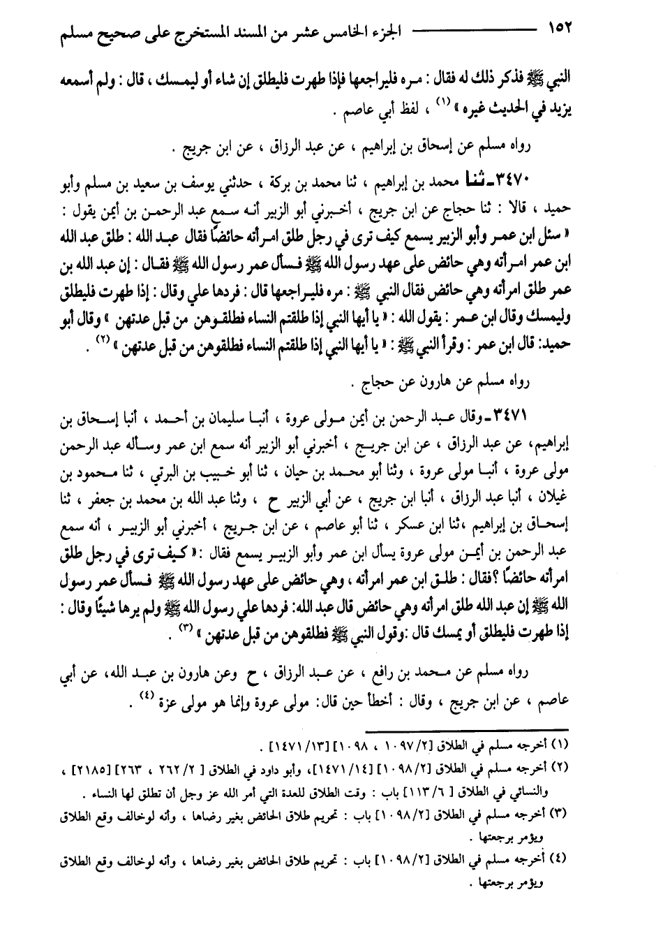 3471 - وَقَالَ عَبْدُ الرَّحْمَنِ بْنُ أَيْمَنَ مَوْلَى عُرْوَةَ أَنْبَأَ سُلَيْمَانُ بْنُ أَحْمَدَ أَنْبَأَ إِسْحَاقُ بْنُ إِبْرَاهِيمَ عَنْ عَبْدِ الرَّزَّاقِ عَنْ ابْنِ جُرَيْجٍ أَخْبَرَنِي أَبُو الزُّبَيْرِ أَنَّهُ سَمِعَ ابْنَ عُمَرَ وَسَأَلَهُ عَبْدُ الرَّحْمَنِ مَوْلَى عُرْوَةَ أَنْبَأَ مَوْلَى عُرْوَةَ وَثنا أَبُو مُحَمَّدِ بْنُ حَيَّانَ ثَنَا أَبُو خُبَيْبِ بْنُ الْبِرْتِيُّ ثَنَا مَحْمُودُ بْنُ غَيْلانَ أَنْبَأَ عَبْدُ الرَّزَّاقِ أَنْبَأَ ابْنِ جُرَيْجٍ عَنْ أَبِي الزُّبَيْرِ ح وَثَنَا عَبْدُ اللَّهِ بْنُ مُحَمَّدِ بْنِ جَعْفَرٍ ثَنَا إِسْحَاقُ بْنُ إِبْرَاهِيمَ ثَنَا ابْنُ عَسْكَرٍ ثَنَا أَبُو عَاصِمٍ عَنِ ابْنِ جُرَيْجٍ أَخْبَرَنِي أَبُو الزُّبَيْرِ أَنَّهُ سَمِعَ عَبْدَ الرَّحْمَنِ بْنَ أَيْمَنَ مَوْلَى عُرْوَةَ يَسْأَلُ ابْنَ عُمَرَ وَأَبُو الزُّبَيْرِ يَسْمَعُ فَقَالَ (كَيْفَ تَرَى فِي رَجُلٍ طَلَّقَ امْرَأَتَهُ حَائِضًا فَقَالَ طَلَّقَ ابْنُ عُمَرَ امْرَأَتَهُ وَهِيَ حَائِضٌ عَلَى عَهْدِ رَسُولُ اللَّهِ صَلَّى اللَّهُ عَلَيْهِ وَسَلَّمَ فَسَأَلَ عُمَرُ رَسُولَ اللَّهِ صَلَّى اللَّهُ عَلَيْهِ وَسَلَّمَ أَنْ عَبْدَ اللَّهِ طَلَّقَ امْرَأَتَهُ وَهِيَ حَائِضٌ قَالَ عَبْدُ اللَّهِ فَرَدَّهَا عَلَى رَسُولِ اللَّهِ صَلَّى اللَّهُ عَلَيْهِ وَسَلَّمَ وَلَمْ يَرَهَا شَيْئًا وَقَالَ إِذَا طَهُرَتْ فَلْيُطَلِّقْ أَوْ يُمْسِكْ قَالَ وَقَوْلُ النَّبِيِّ صَلَّى اللَّهُ عَلَيْهِ وَسَلَّمَ فَطَلِّقُوهُنَّ مِنْ قَبْلِ عِدَّتِهِنَّ)