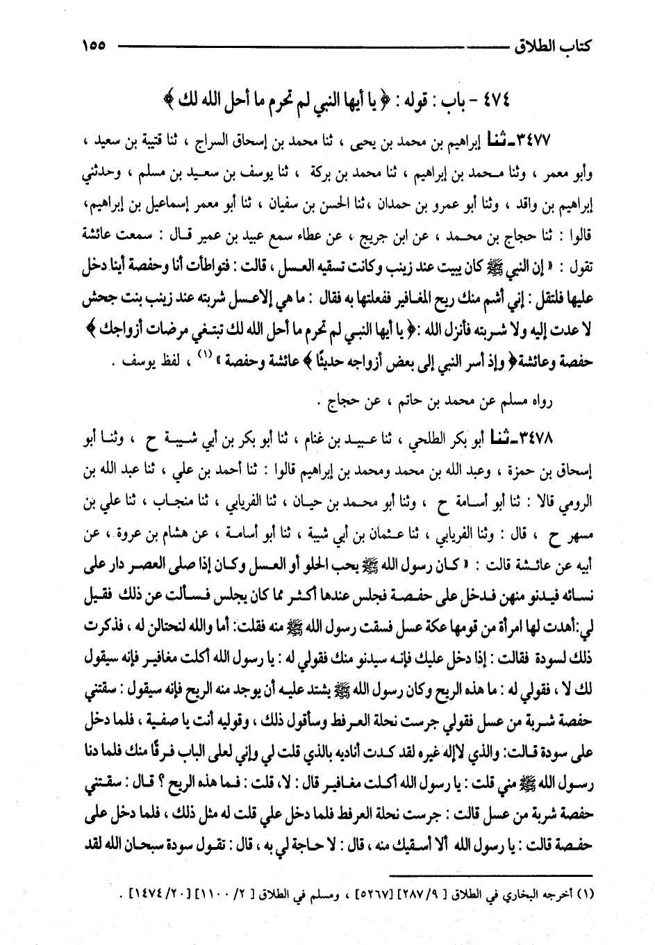 3477 - ثَنَا إِبْرَاهِيمُ بْنُ مُحَمَّدِ بْنِ يحيي ثَنَا مُحَمَّدُ بْنُ إِسْحَاقَ السَّرَّاجُ ثَنَا قُتَيْبَةُ بْنُ سَعِيدٍ وَأَبُو مَعْمَرٍ وَثنا مُحَمَّدُ بْنُ إِبْرَاهِيمَ ثَنَا مُحَمَّدُ بْنُ بَرَكَة ثَنَا يُوسُفُ بْنُ سَعِيدِ بْنِ مُسلم وحَدثني إِبْرَاهِيم بن وَاقد وَثَنَا أَبُو عَمْرِو بْنُ حَمْدَانَ ثَنَا الْحَسَنُ بْنُ سُفْيَانَ ثَنَا أَبُو مَعْمَرٍ إِسْمَاعِيلُ بْنُ إِبْرَاهِيمَ قَالُوا ثَنَا حَجَّاجُ بْنُ مُحَمَّدٍ عَنِ ابْنِ جُرَيْجٍ عَنْ عَطَاءٍ سَمِعَ عُبَيْدُ بْنُ عُمَيْرٍ قَالَ سَمِعْتُ عَائِشَةَ تَقُولُ (إِنَّ النَّبِيَّ صَلَّى اللَّهُ عَلَيْهِ وَسَلَّمَ كَانَ يَبِيتُ عِنْدَ زَيْنَبَ وَكَانَتْ تَسْقِيهِ الْعَسَلَ قَالَتْ فَتَوَاطَأْتُ أَنَا وَحَفْصَةُ أَيّنَا دَخَلَ عَلَيْهَا فَلْتَقُلْ إِنِّي أَشُمُّ مِنْكَ رِيحَ الْمَغَافِيرِ فَفَعَلْتُهَا بِهِ فَقَالَ مَا هِيَ إِلَّا عَسَلٌ شَرِبْتُهُ عِنْدَ زَيْنَبَ بِنْتِ جَحْشٍ لَا عُدْتِ إِلَيْهِ وَلا شَرِبْتُهُ فَأنْزل الله {يَا أَيهَا النَّبِيُّ لِمَ تُحَرِّمُ مَا أَحَلَّ اللَّهُ لَكَ تَبْتَغِي مَرْضَاتَ أَزْوَاجِكَ} حَفْصَةَ وَعَائِشَةَ {وَإِذْ أَسَرَّ النَّبِيُّ إِلَى بعض أَزوَاجه حَدِيثا} عَائِشَةَ وَحَفْصَةَ) لَفْظُ يُوسُفَ